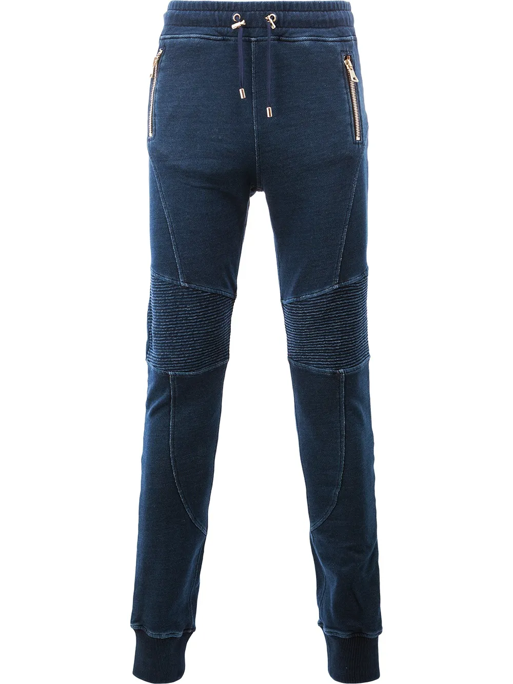 Синие хлопковые спортивные брюки 'Biker' от Balmain. Эластичный пояс со шнурком, карманы на молнии сбоку, ребристые детали, задний карман.