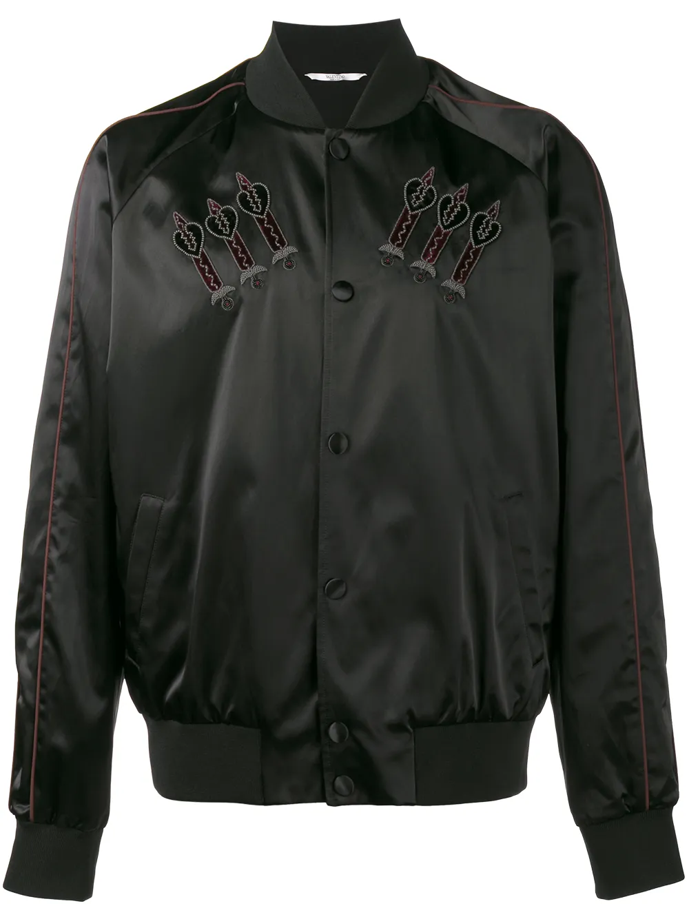 Черный эластичный хлопковый бомбер 'Love Blade' от Valentino(Валентино). Стоячий воротник, застежка на кнопках, вышитая деталь, два передних кармана, длинные рукава.