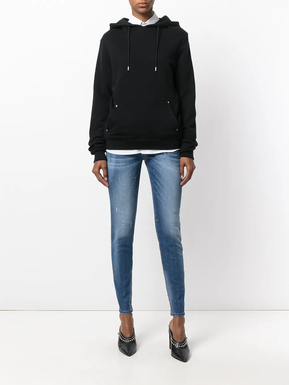 Синие джинсы из хлопкового микса с классической талией 'Twiggy' от Dsquared2(Дискваред). Ширинка на молнии с пуговицей, петли для ремня, классическая пятикарманная модель, складки на бедрах, эффект потертости, вставка с логотипом сзади, выцветший эффект.