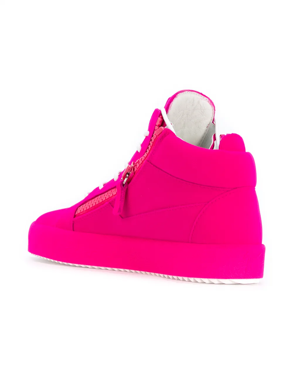 Ярко-розовые кожаные хайтопы на шнуровке от Giuseppe Zanotti Design(Джузеппе Занотти). Закругленный носок, высокая щиколотка, шнуровка спереди, плоская резиновая подошва, боковая молния.