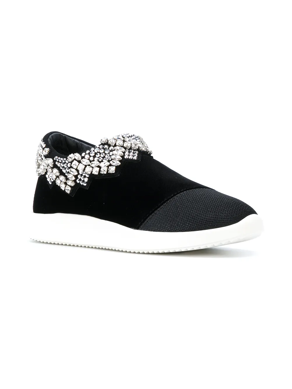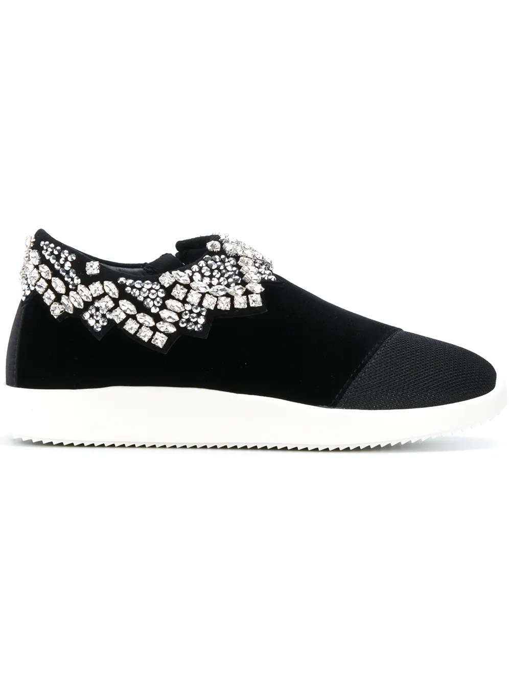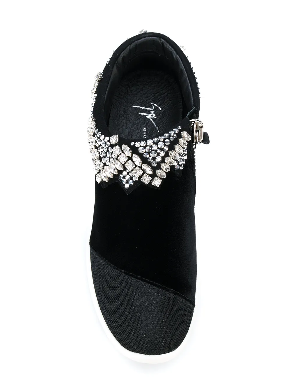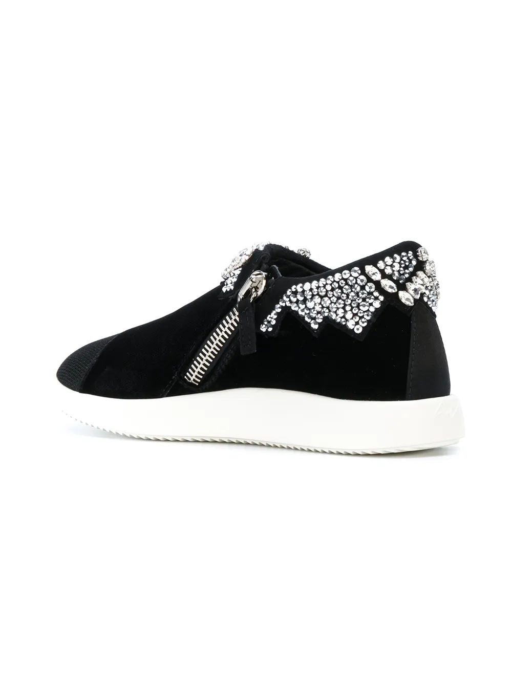 Черные кроссовки 'Gemma' из кожи и бархата от Giuseppe Zanotti Design(Джузеппе Занотти). Закругленный носок, украшение из кристаллов, плоская резиновая подошва, стелька с тиснением бренда.