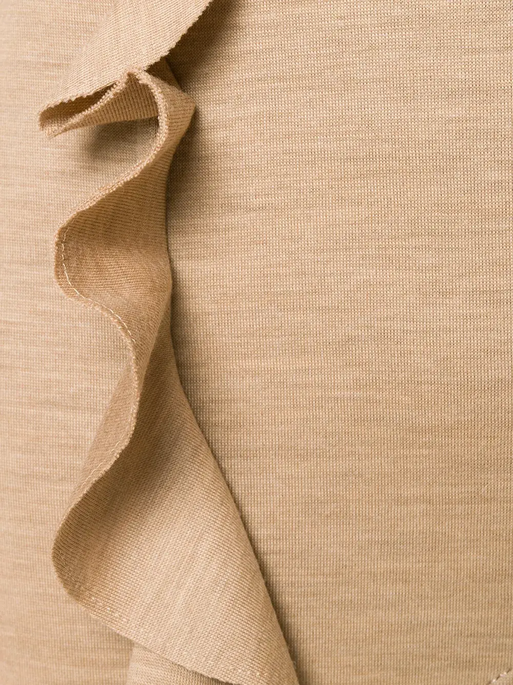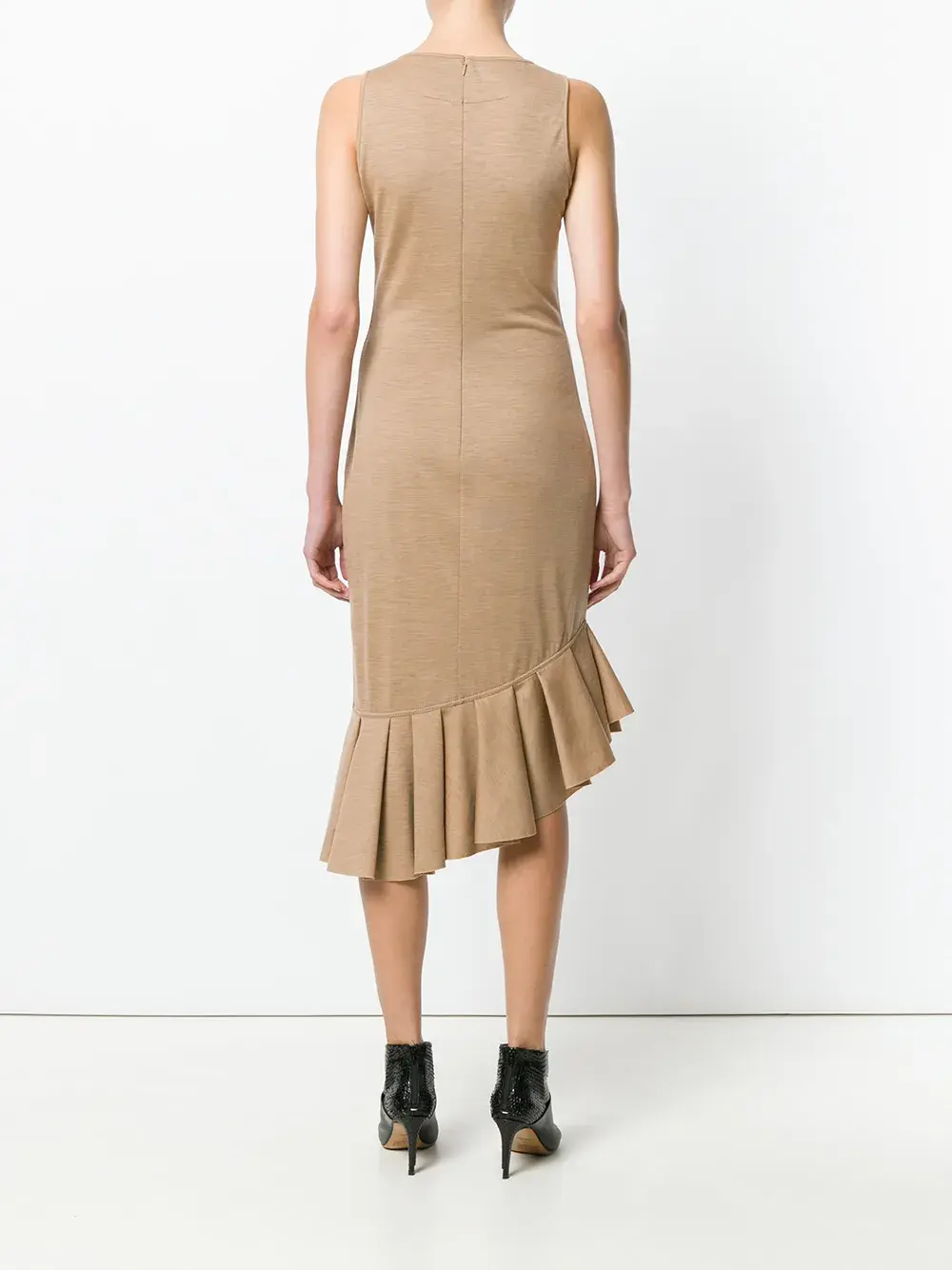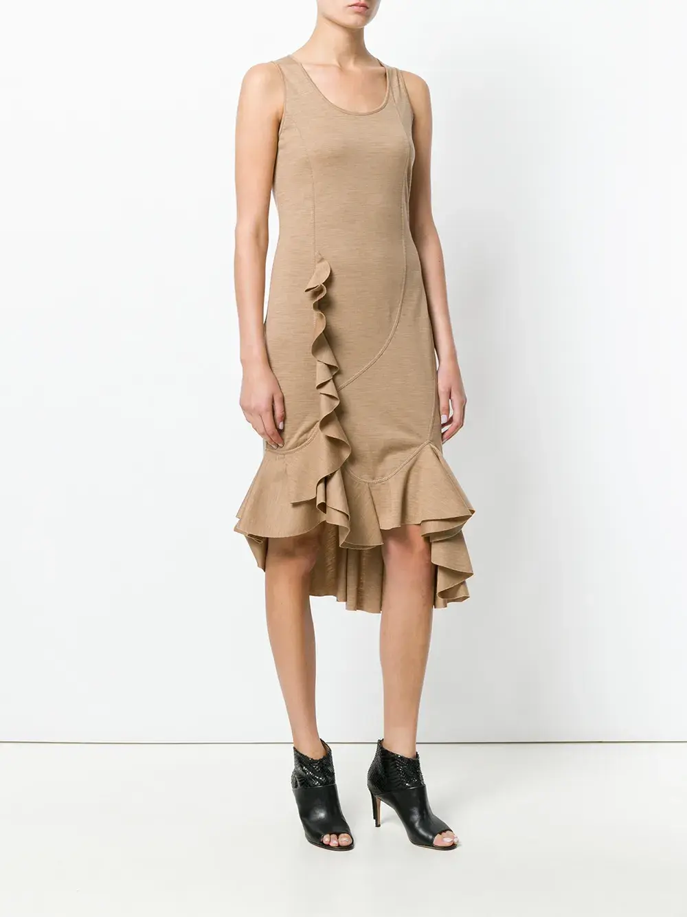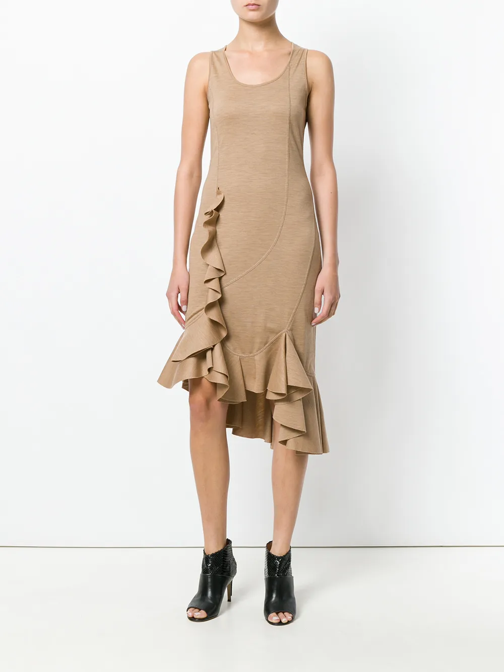 Бежевое шерстяное платье миди с оборкой от Givenchy(Живанши). Оборочная отделка, круглый вырез, модель без рукавов, средней длины, приталенный силуэт.