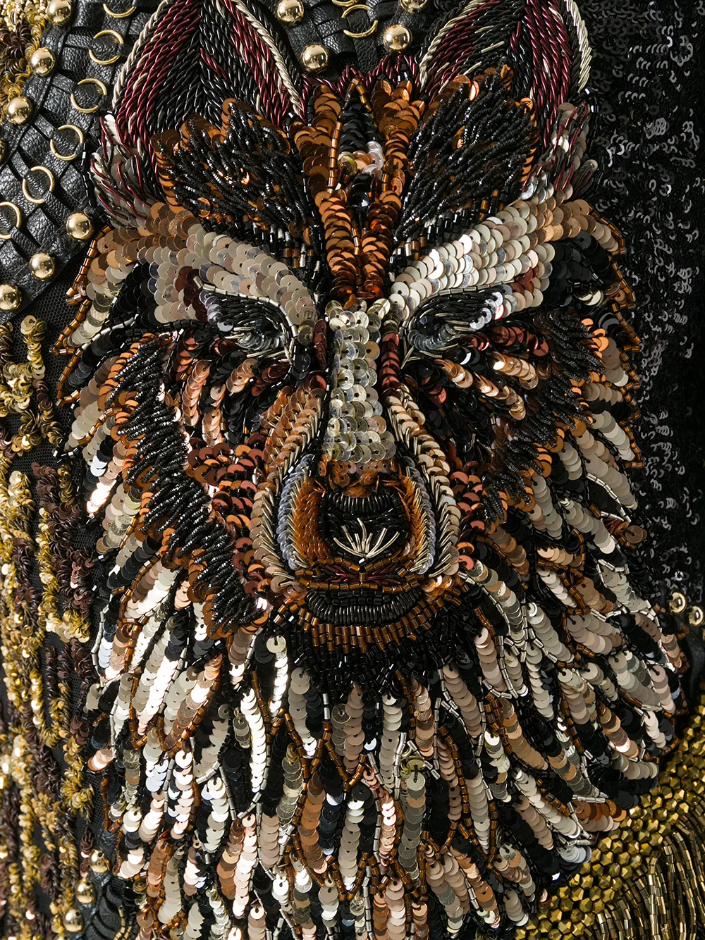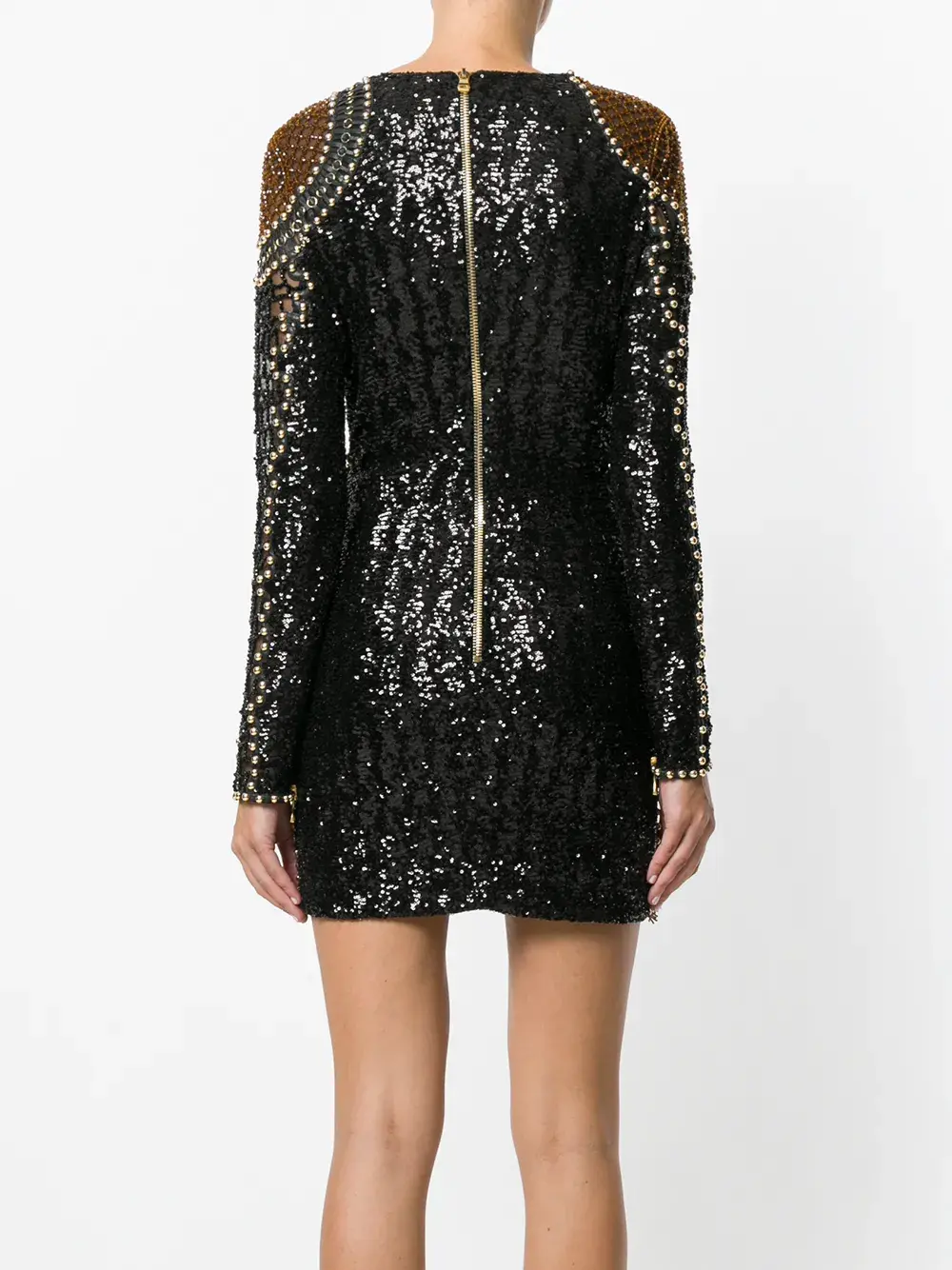 Черное декорированное платье 'Wolf' из шелкового микса от Balmain(Бальман). V-образная горловина, длинные рукава, золотистые заклепки, детали с бахромой, украшение из пайеток, украшение из бусин, застежка на молнии сзади.