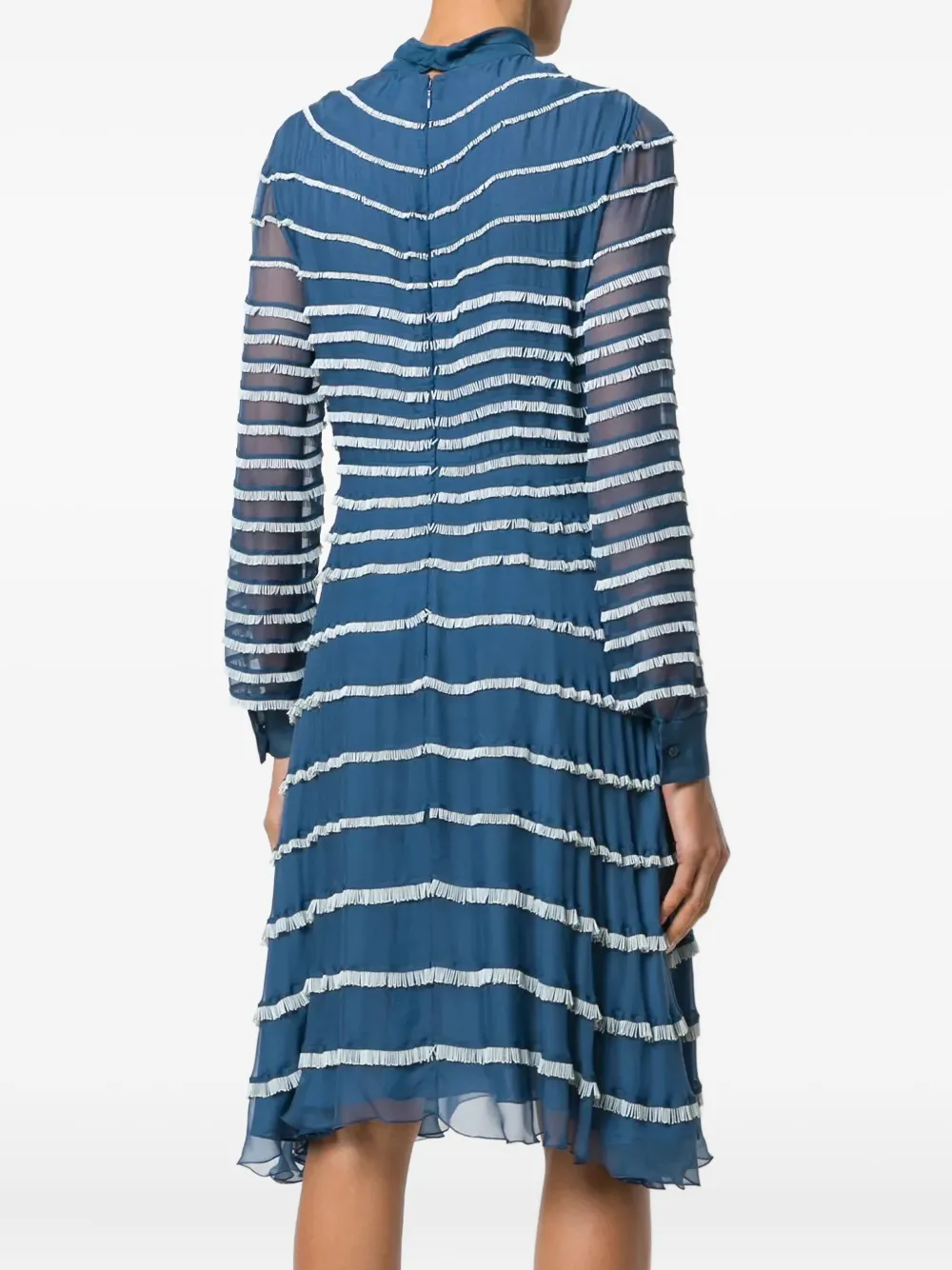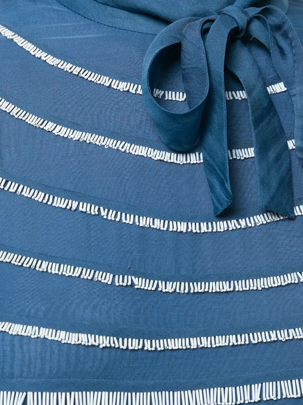 Синее шелковое платье с бахромой от Valentino(Валентино). Асимметричный крой, горловина на ленточной завязке, длинные рукава, средней длины, дизайн с бахромой.