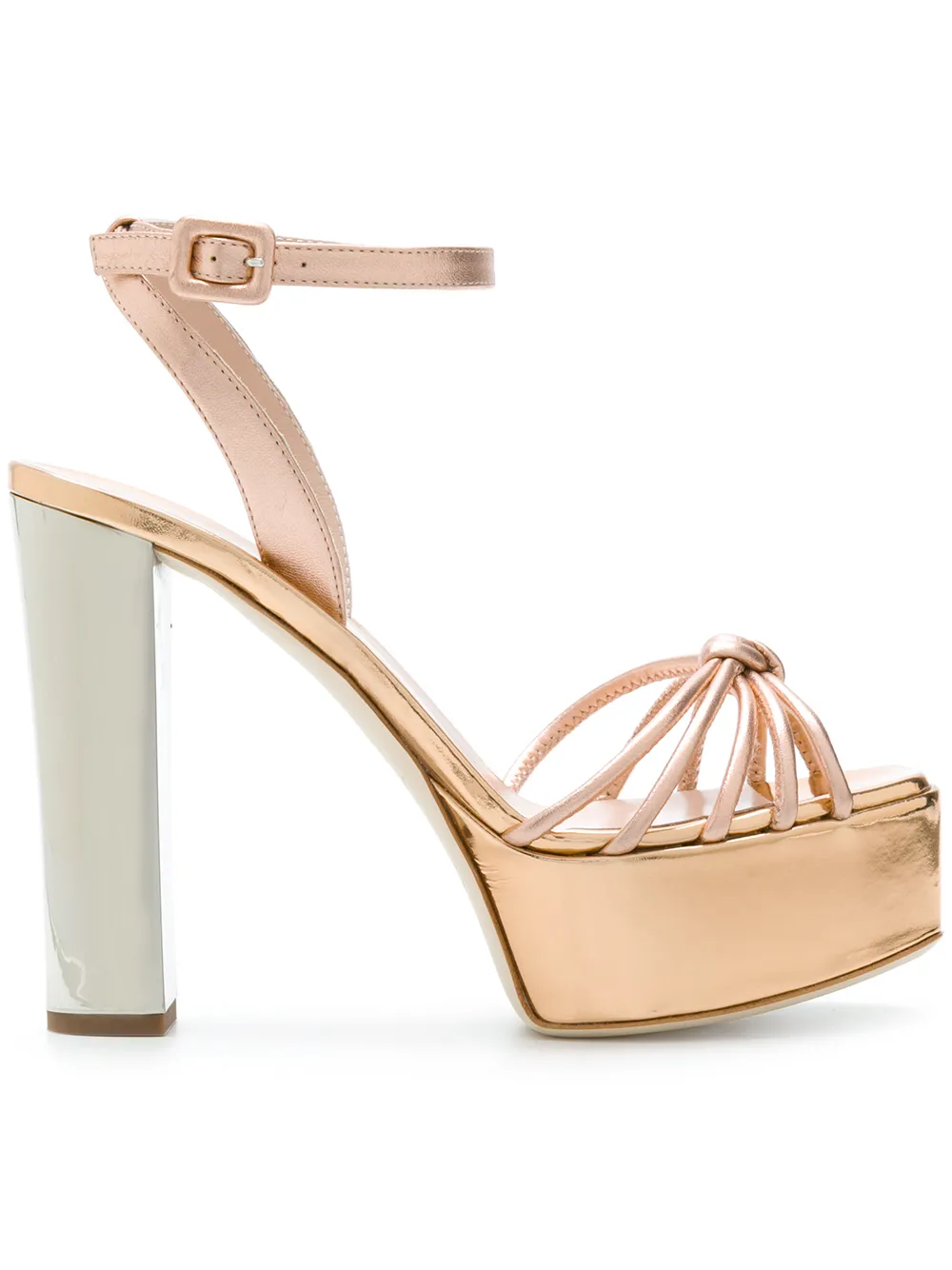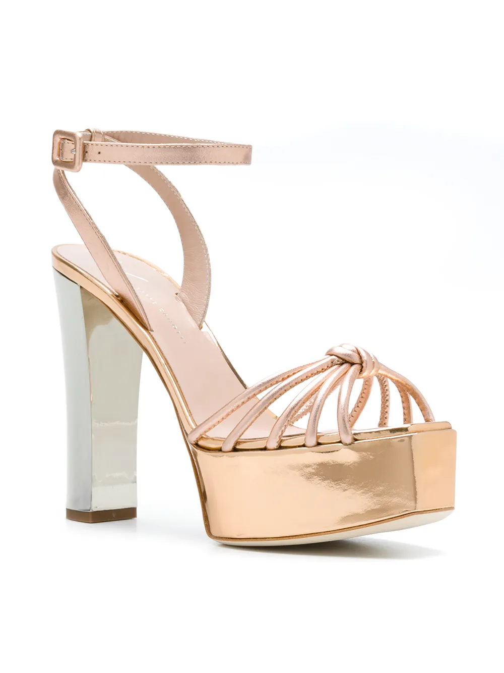 Розовые с серебристым босоножки 'Lavini' из лакированной и телячьей кожи от Giuseppe Zanotti Design(Джузеппе Занотти). Открытый носок, дизайн с ремешками, ремешок на щиколотке и пряжка сбоку, фирменная стелька, подошва на платформе, высокий каблук.