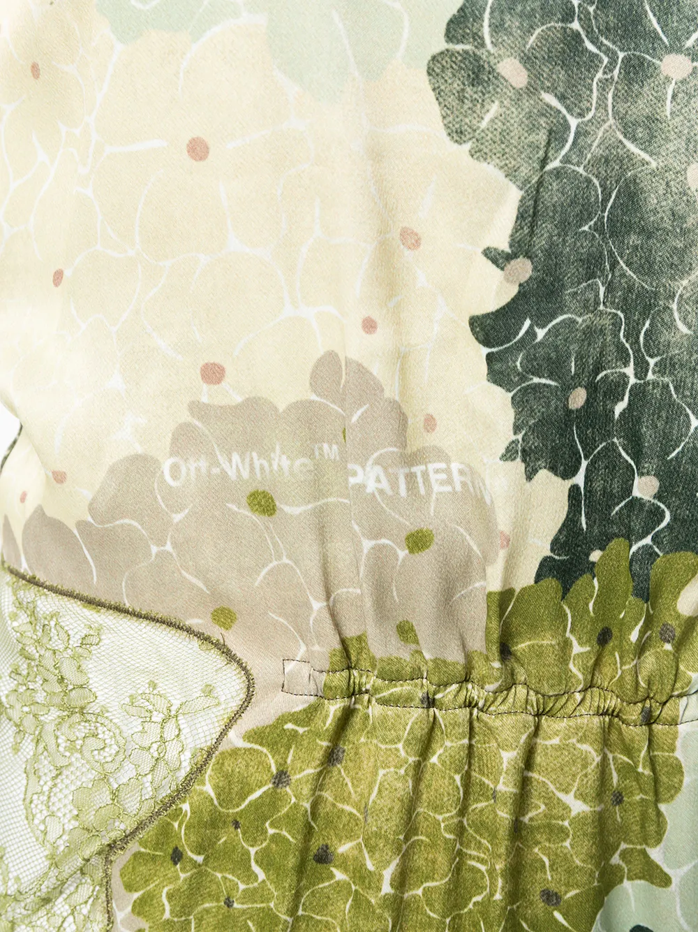 Зеленое короткое платье с кружевными панелями от Off-White. Вырез стиля сердце, модель без рукавов, внутренний эластичный ободок , цветочный принт, деталь из кружева, короткая длина.