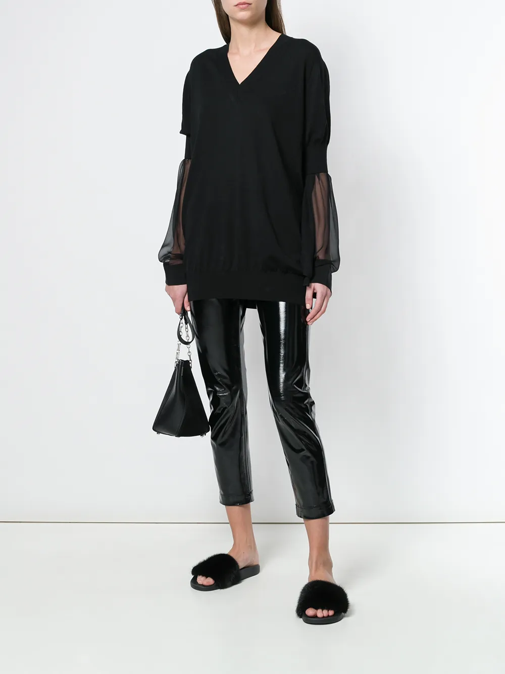 Черный шелково-шерстяной топ с глубоким V-образным вырезом от Givenchy(Живанши). Панельные длинные рукава, эластичные манжеты, эластичный пояс.