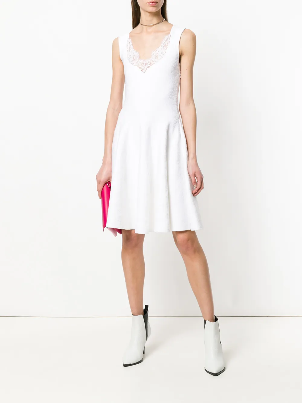Белое расклешенное кружевное платье от Givenchy(Живанши). V-образная горловина, модель без рукавов, приталенный крой, расклешенная юбка, короткая длина, деталь из кружева.