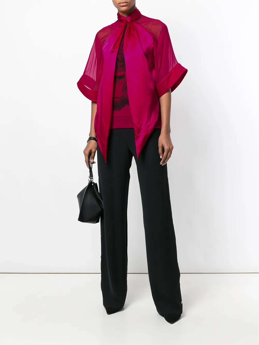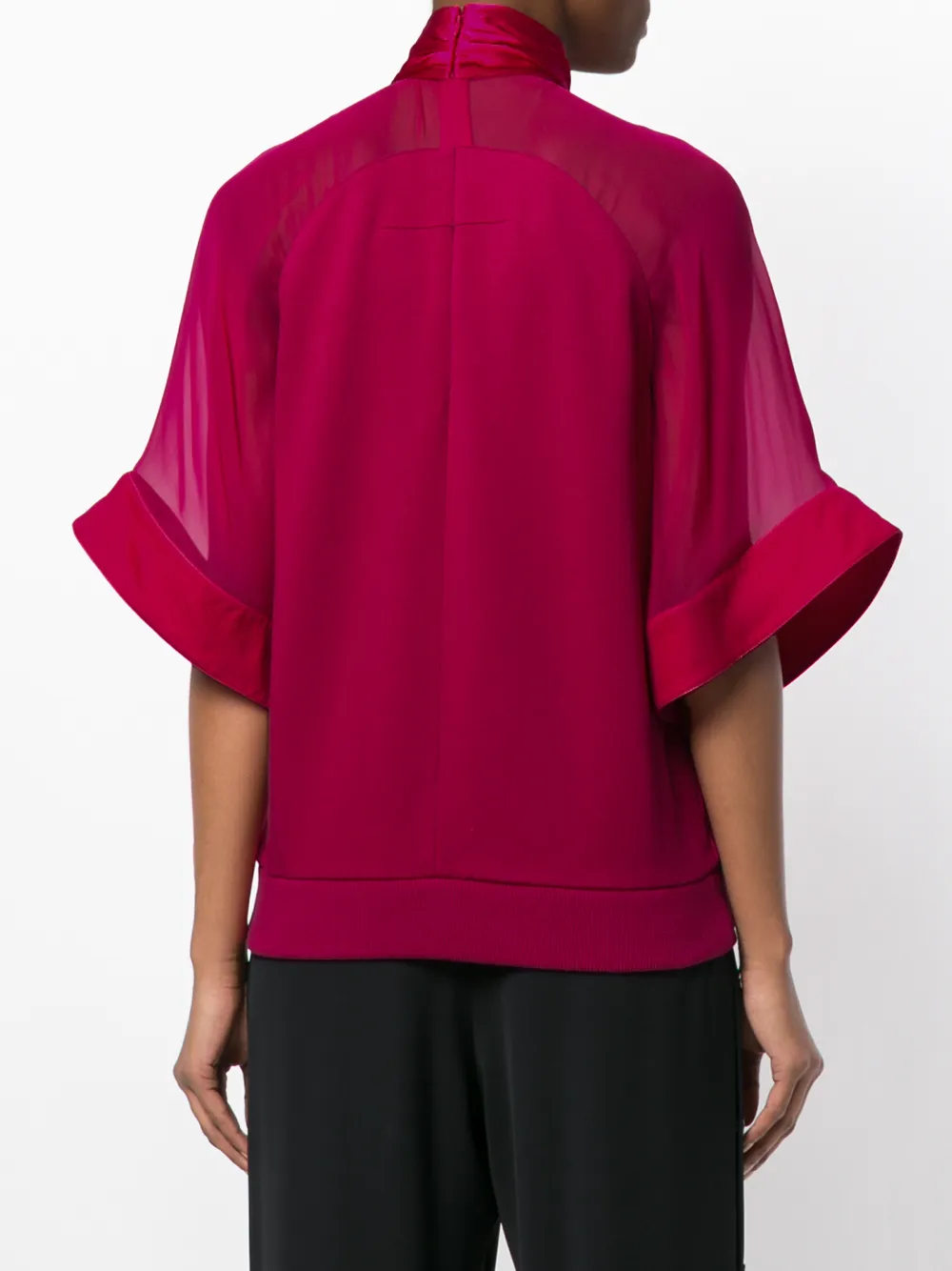 Малиновый драпированная блзука из шелка, хлопка и шерсти с принтом ротвейлера от Givenchy(Живанши). Прозрачные панели, короткие рукава реглан, фирменная вышивка крестом, ребристый подол.