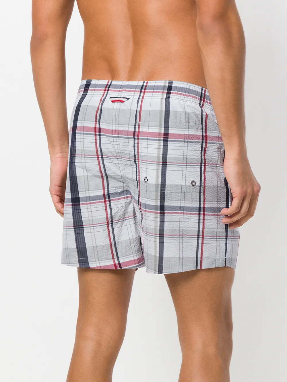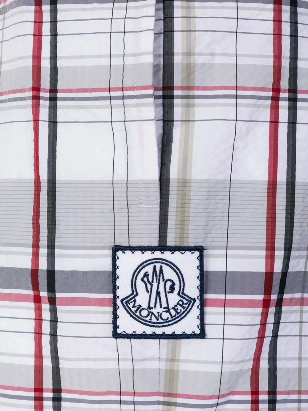 Белые шорты для плавания в клетку от Moncler(Монклер). Талия на эластичном шнурке, прорезные карманы по бокам, фирменная трехцветная полоска, накладной карман сзади, модель без застежки. Примерка купальников разрешена только поверх собственного нижнего белья.