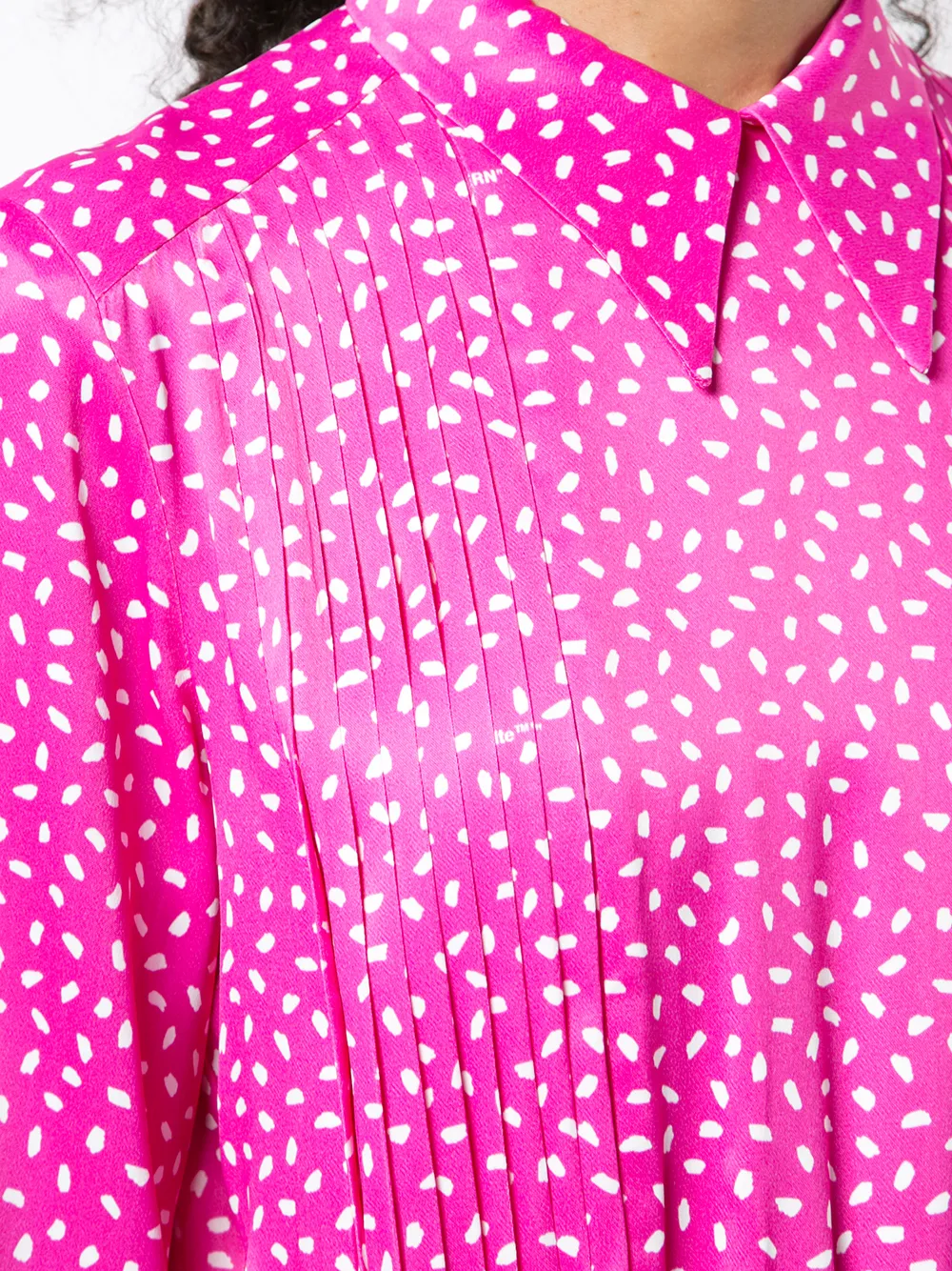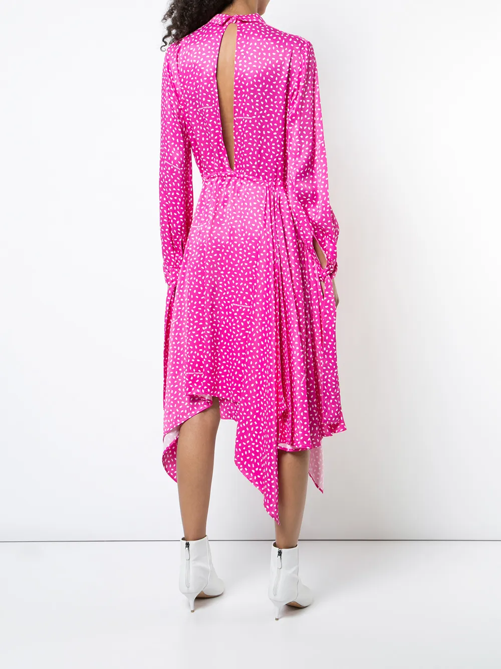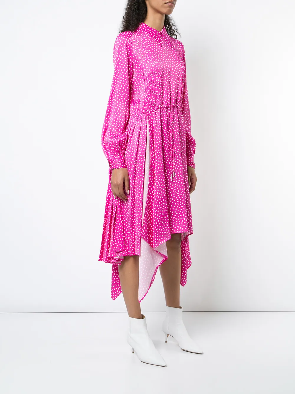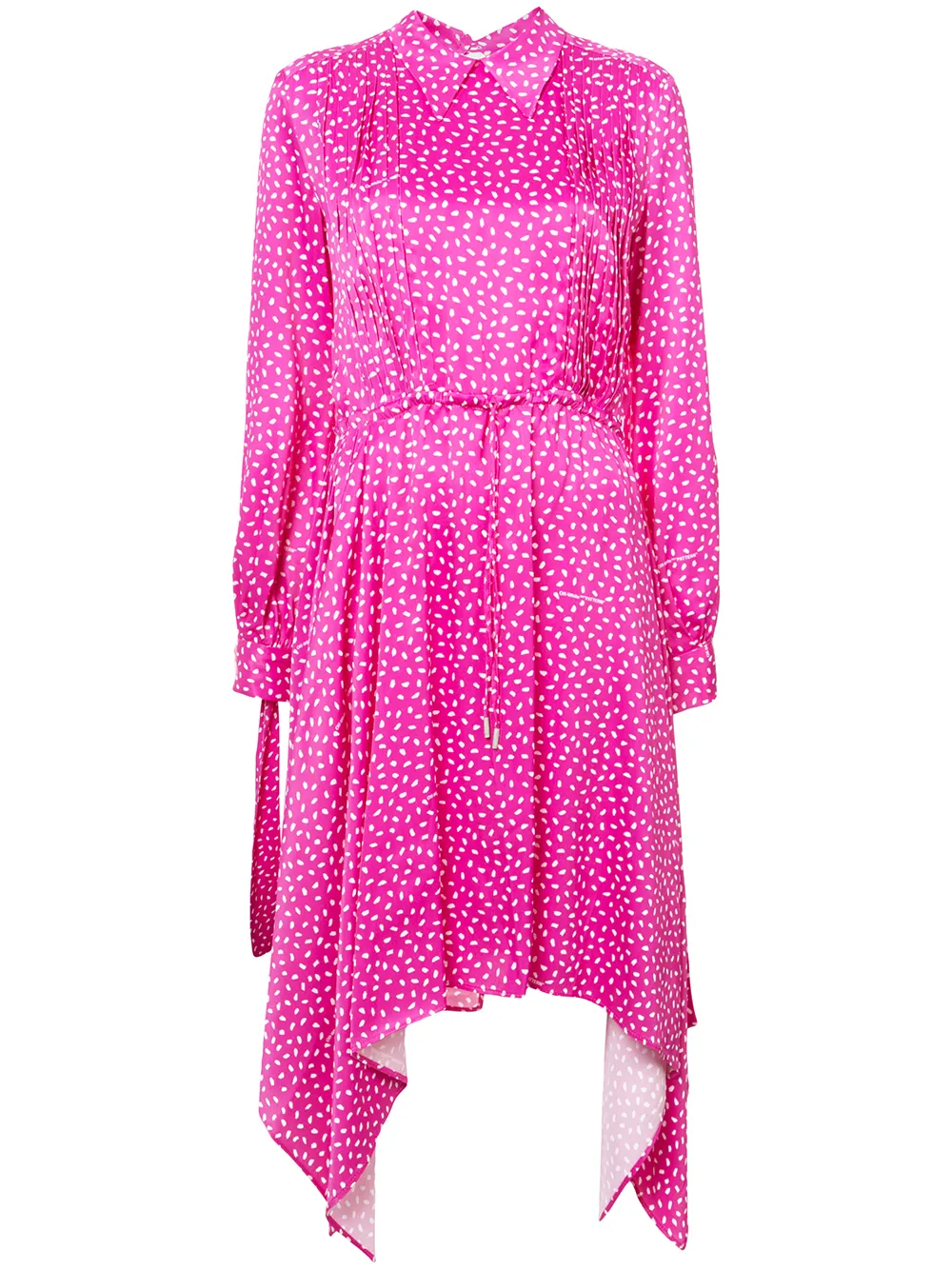 Розовое платье с принтом от Off-White. Классический воротник, длинные рукава, манжеты на пуговицах, приталенный крой, асимметричный подол.