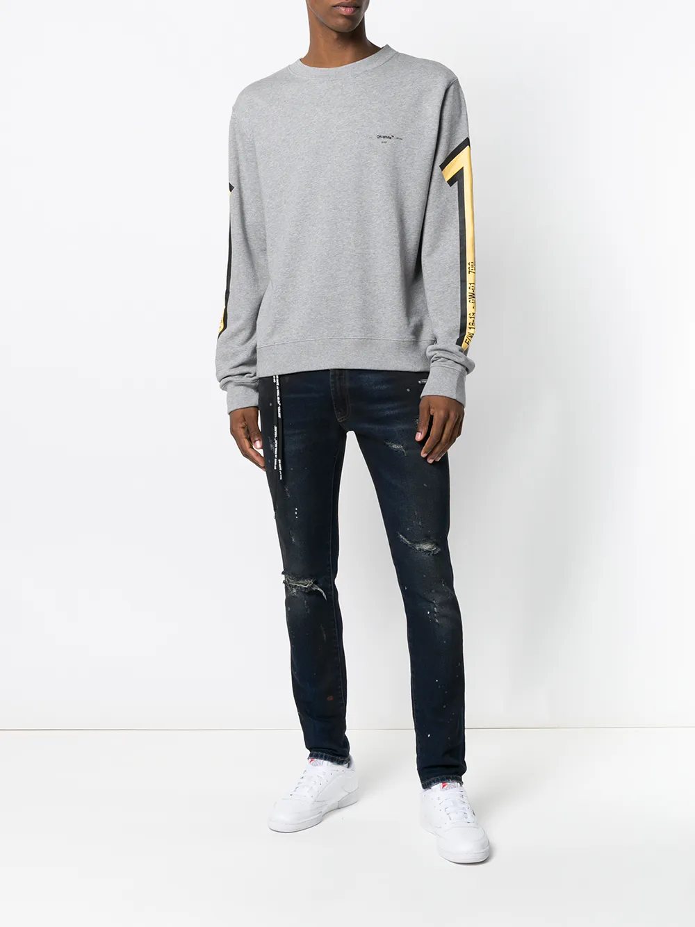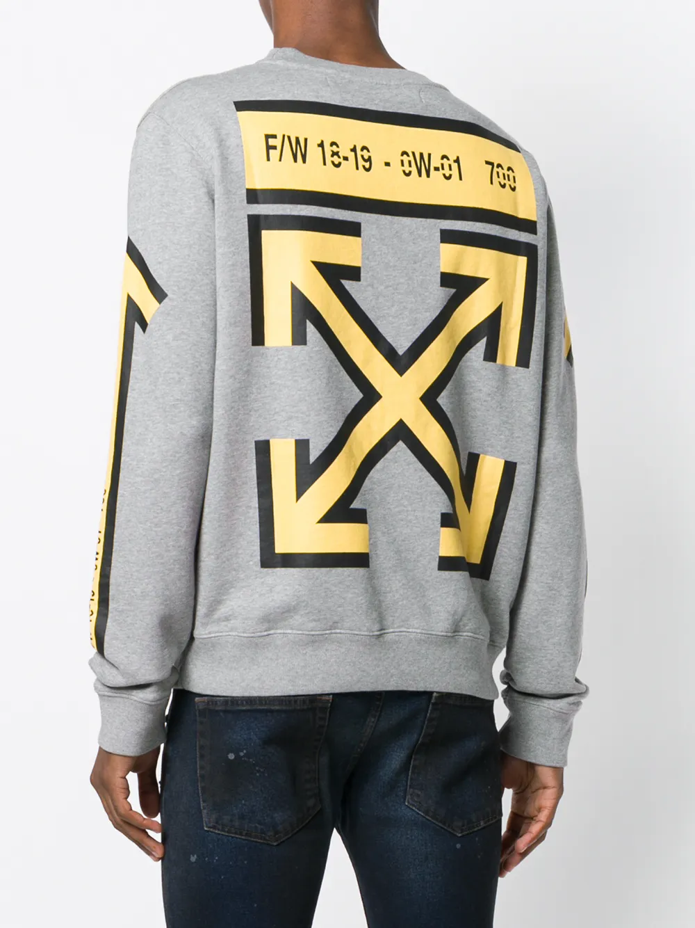 Серая хлопковая толстовка со стрелками от Off-White. Круглый вырез, логотип на груди, узор сзади, длинные рукава, узкие манжеты, прямой подол.