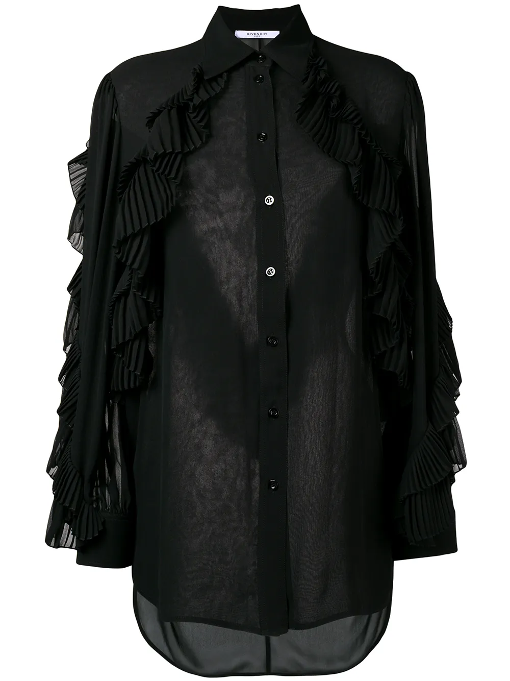 Черная прозрачная блузка из хлопкового микса с оборками от Givenchy(Живанши). Длинные рукава, застежка на пуговицы.