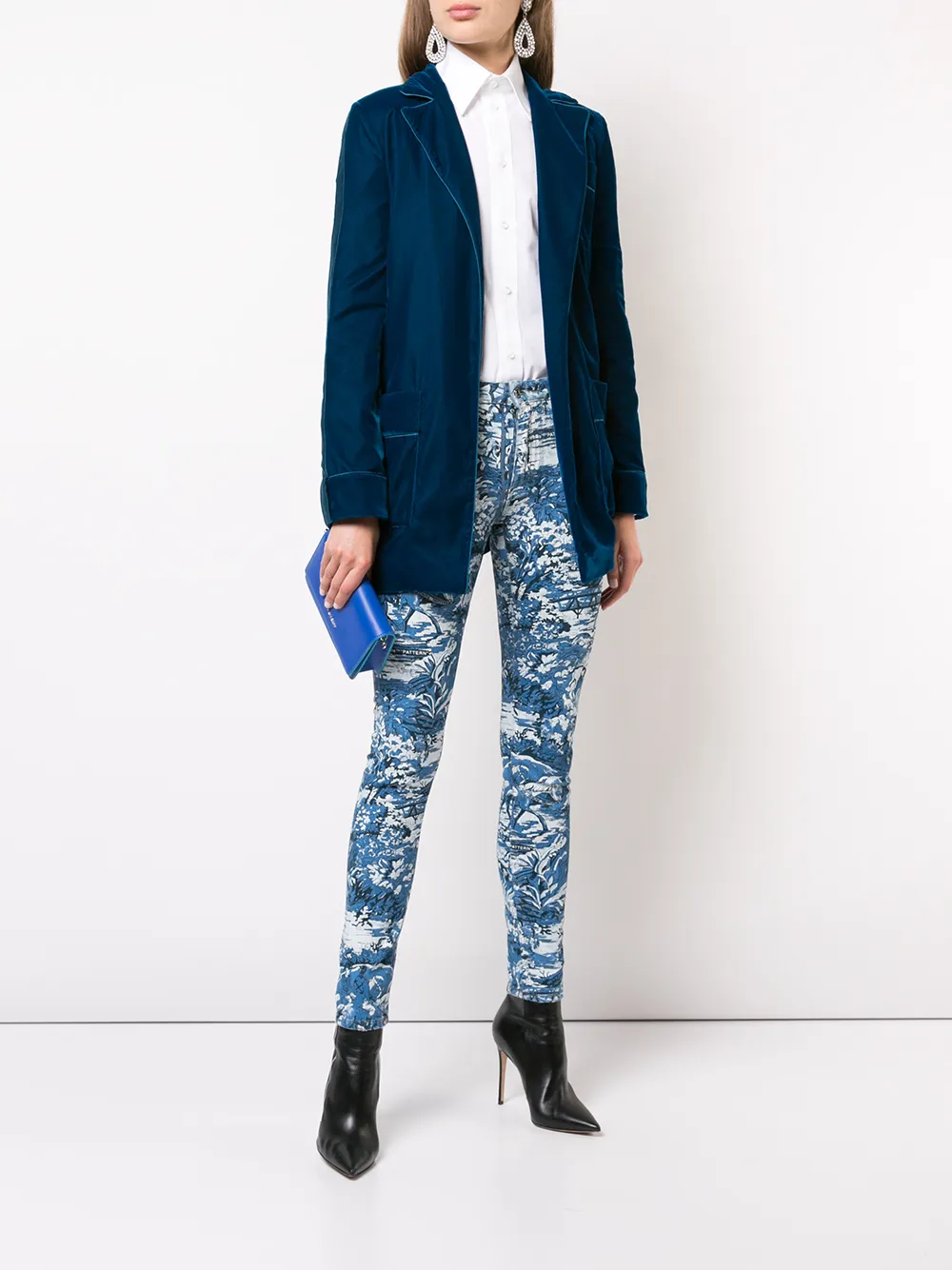 Синие джинсы скинни из хлопкового микса с принтом от Off-White. Классическая пятикарманная модель, средняя посадка, пояс с петлями для ремня, ширинка на молнии с пуговицей, стиль "скинни", эластичная модель, сплошной узор.