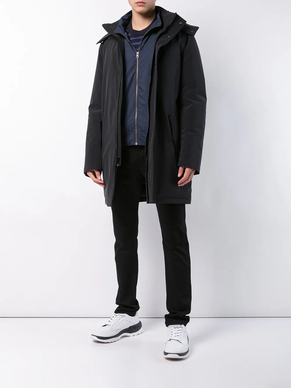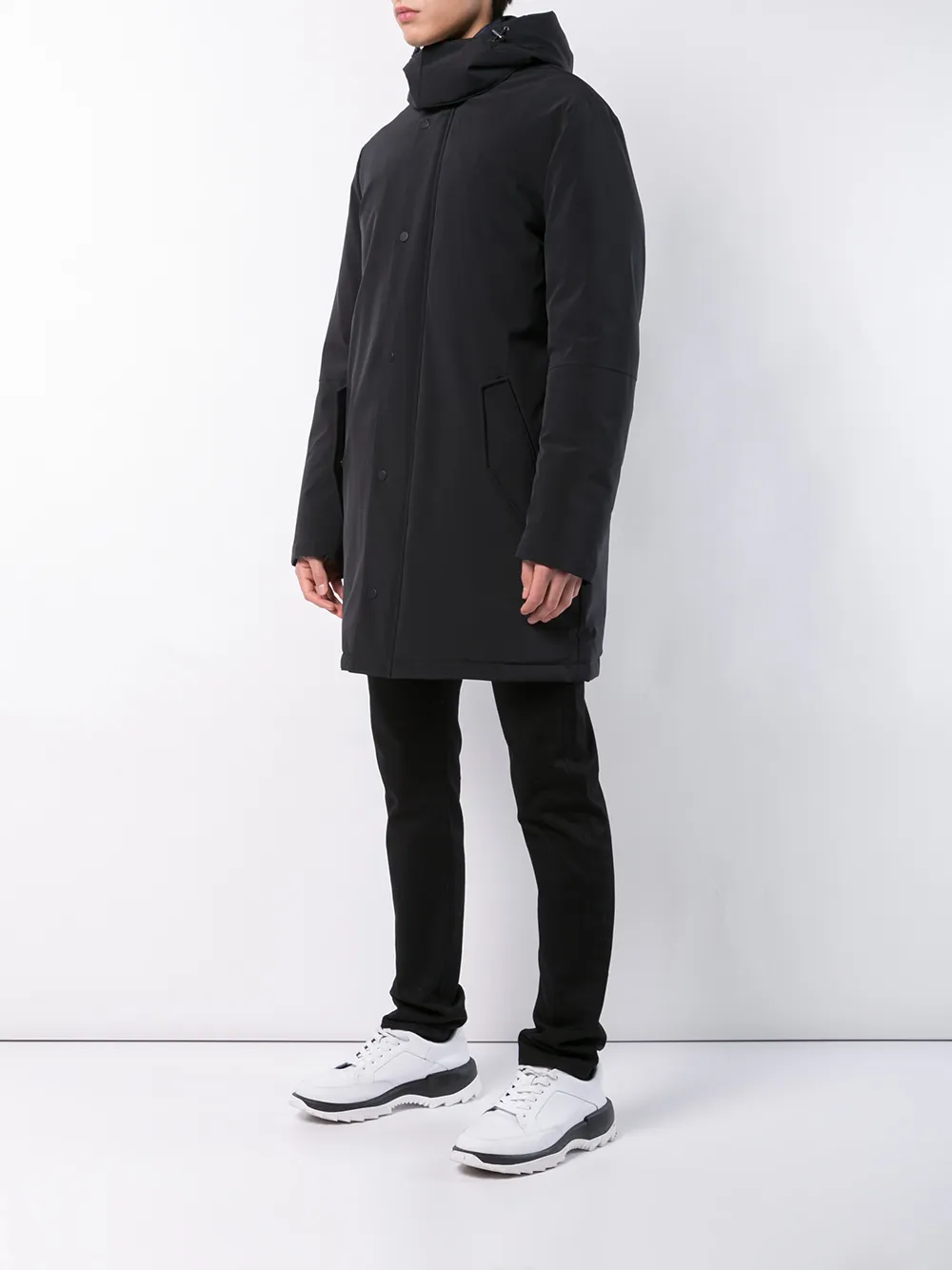 Парка Shadow Mountain от Aztech Mountain. Съемный капюшон, потайная застежка на молнии, застежка на кнопках, карманы с клапанами сбоку, длинные рукава, средней длины, обитая внутренняя сторона и прямой подол. Цвет: черный.