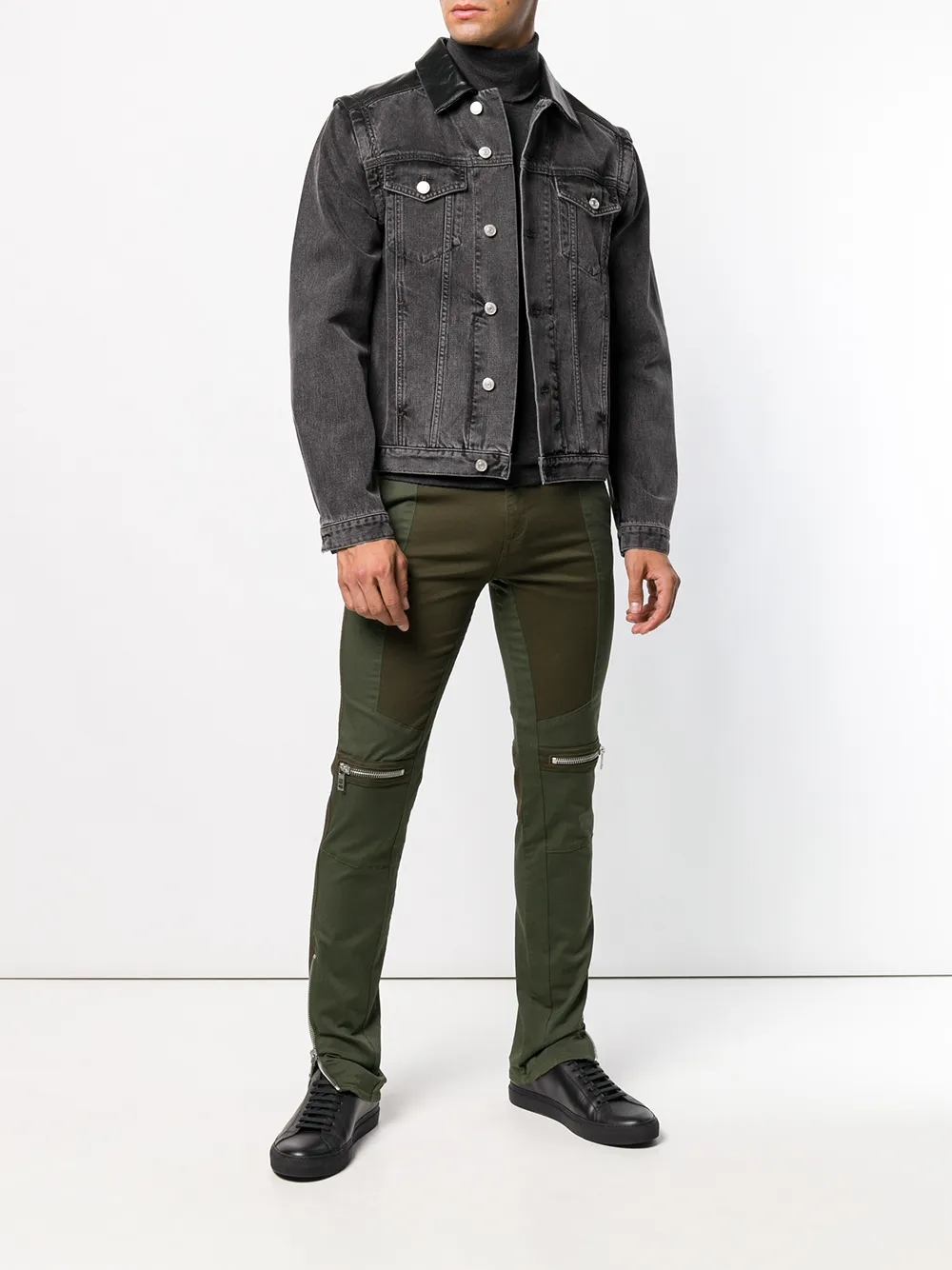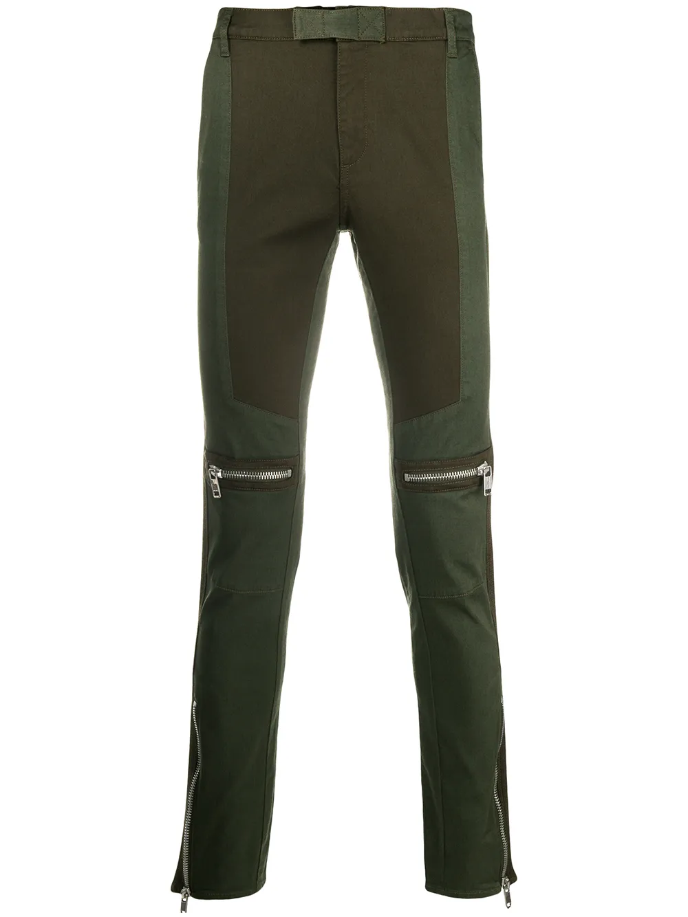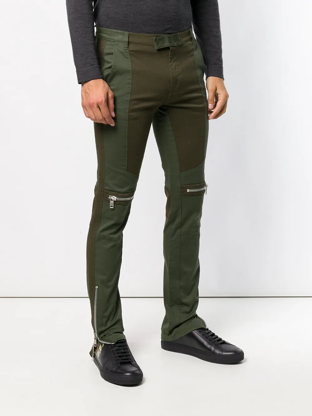 Темно-зеленые хлопковые байкерские брюки кроя слим от Givenchy(Живанши). Пояс с петлями для ремня, ширинка на крючке и молнии.