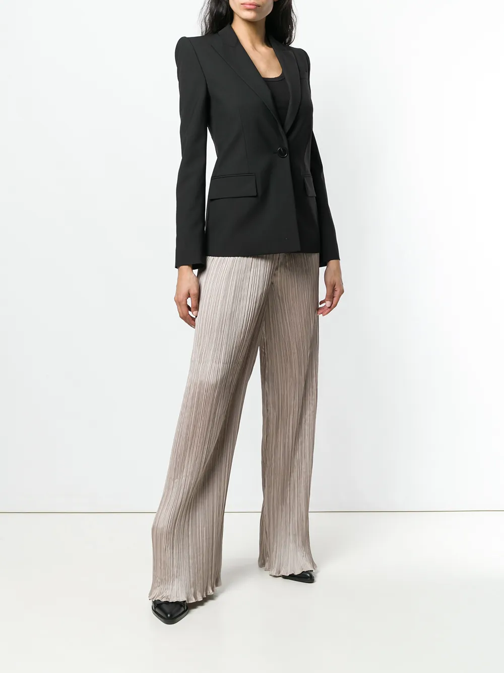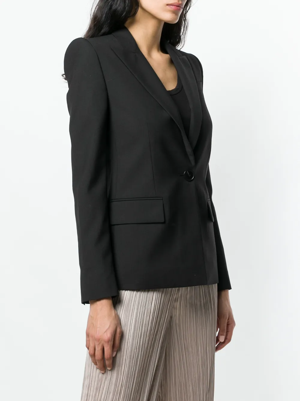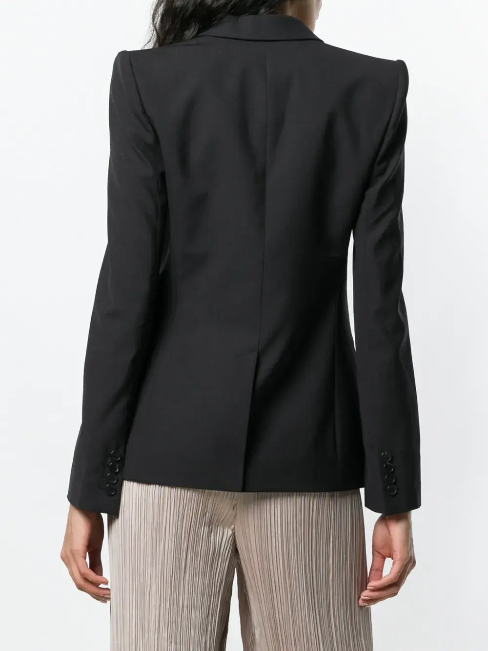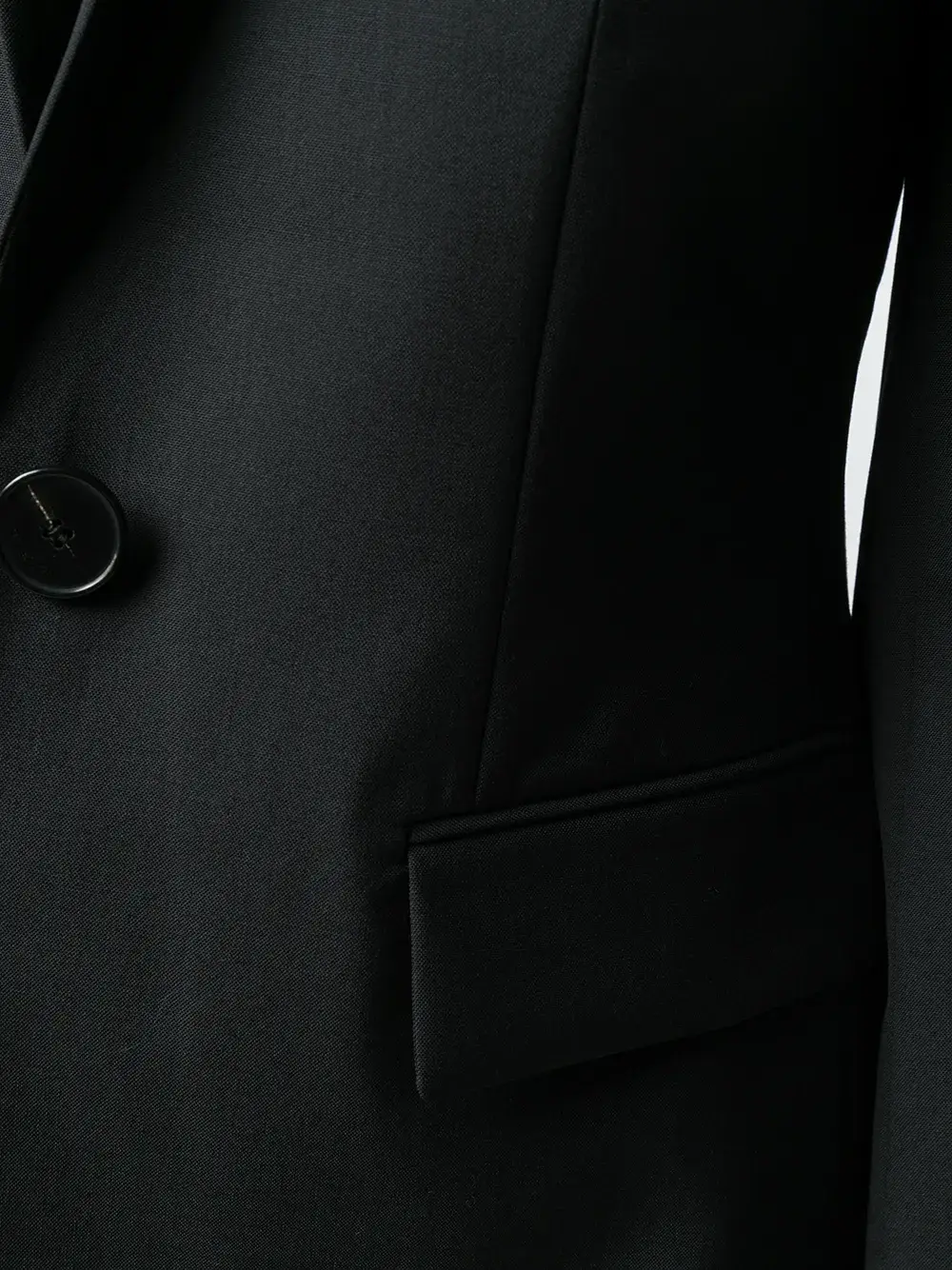 Однобортный пиджак от Givenchy (Живанши). Заостренные лацканы, застежка на пуговицах спереди, длинные рукава, манжеты на пуговицах, нагрудный карман, приталенный силуэт, передние карманы с клапанами, шлица сзади и подкладка с логотипом. Цвет: черный.