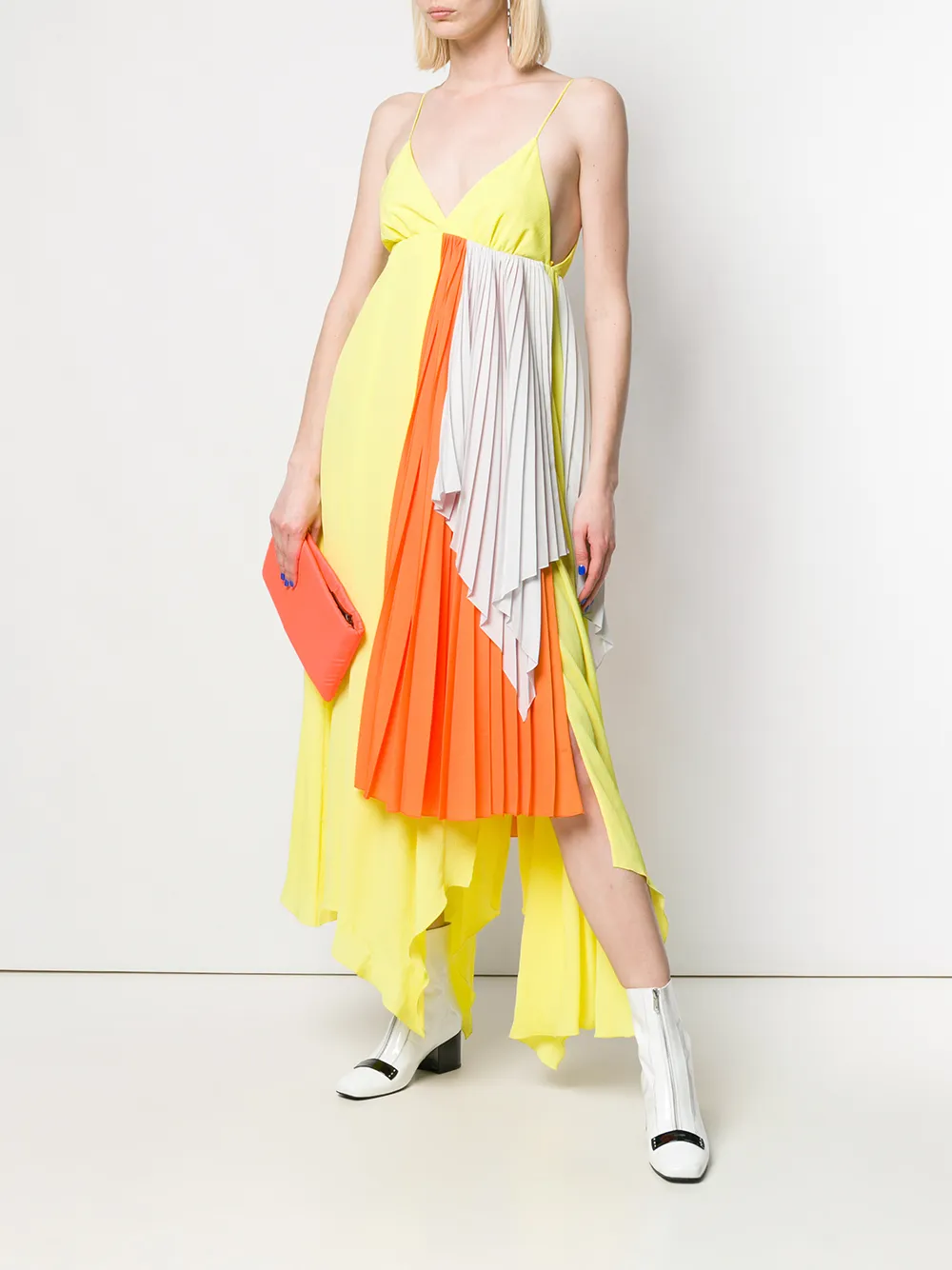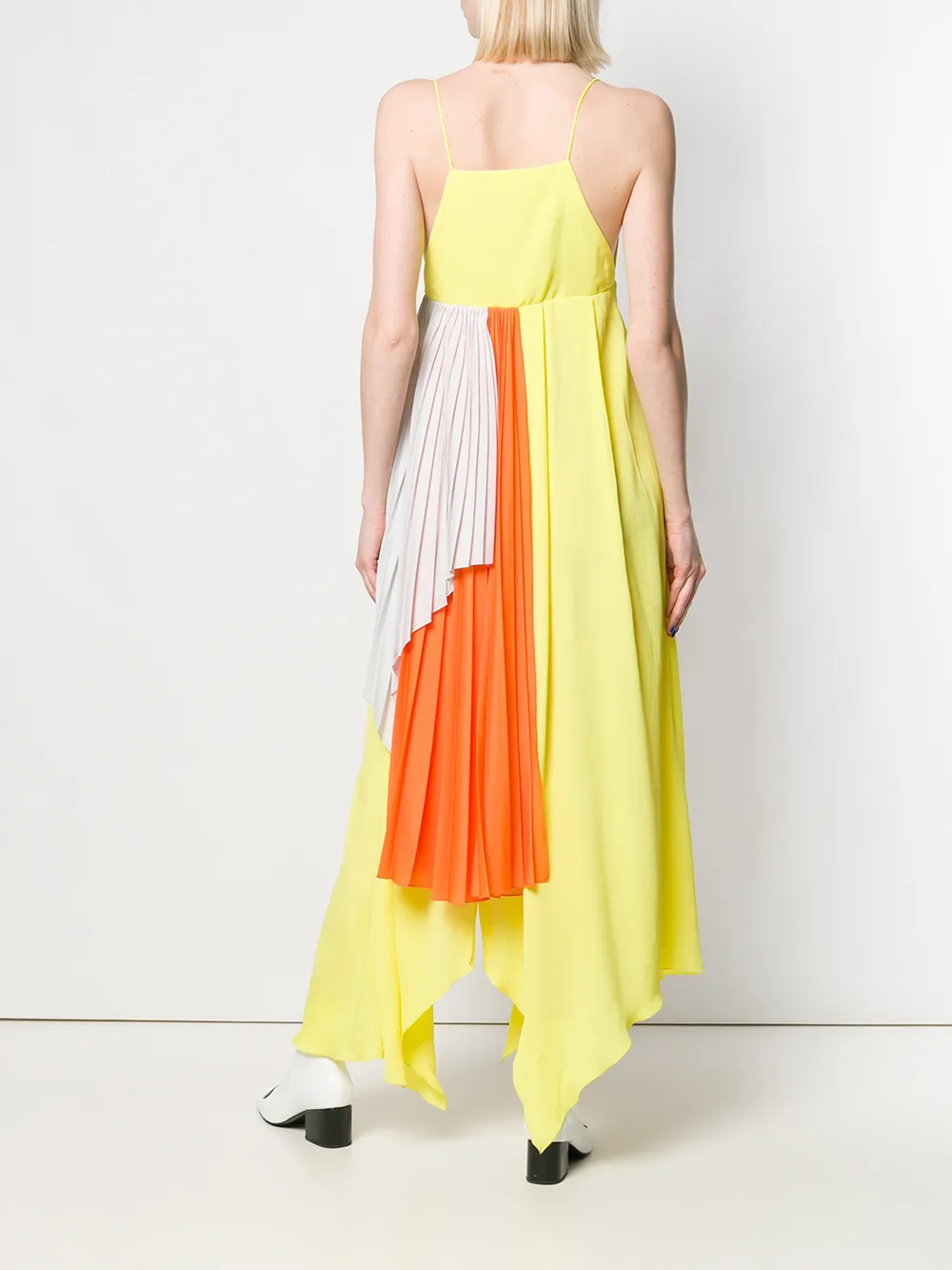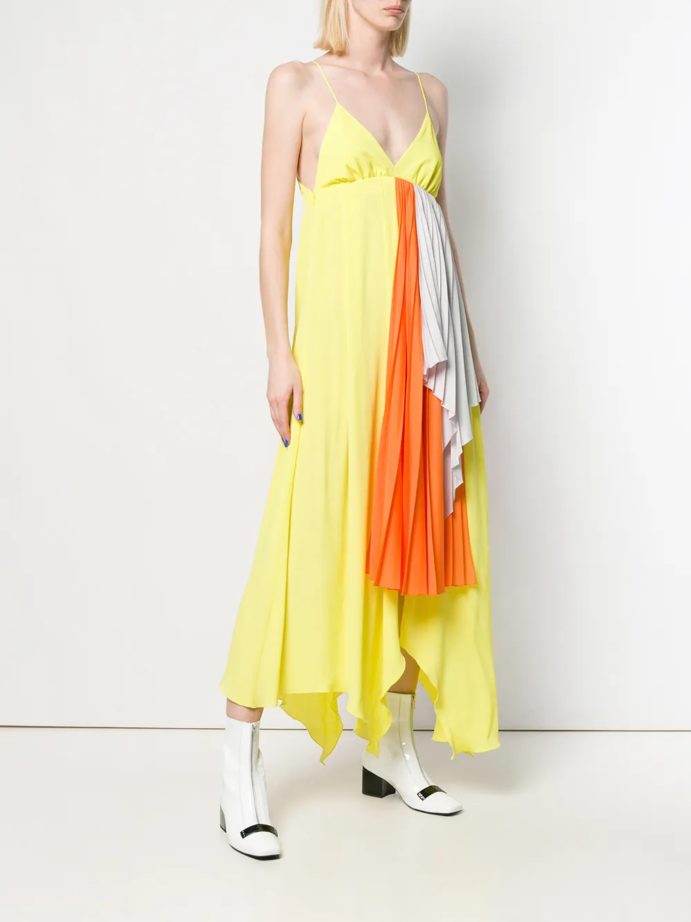 Платье с плиссировкой и драпировкой от Unravel Project. Тонкие лямки-спагетти, модель с треугольными чашечками, неровный необработанный подол и удлиненная модель. Цвет: желтый.