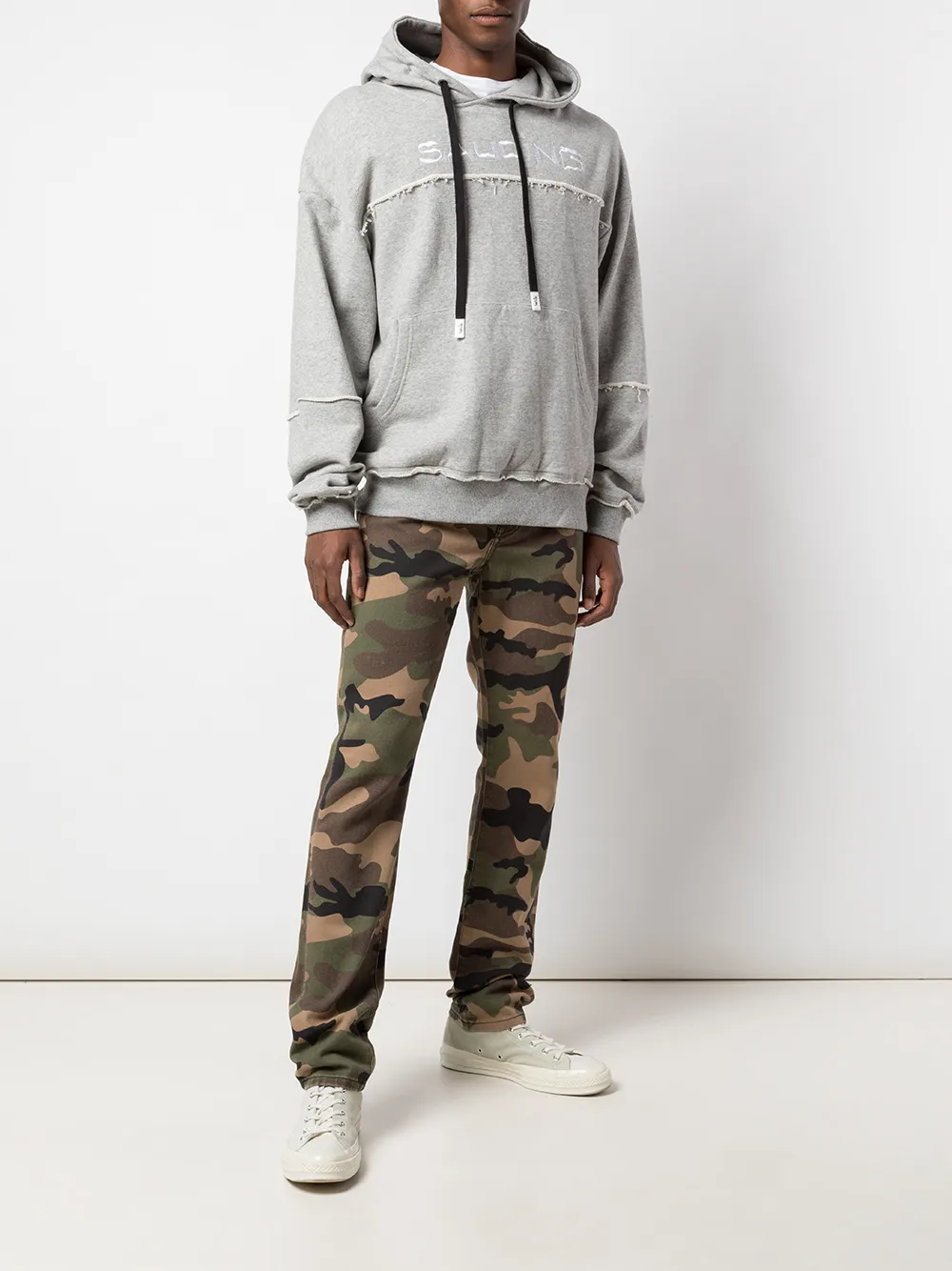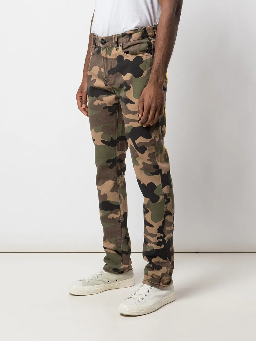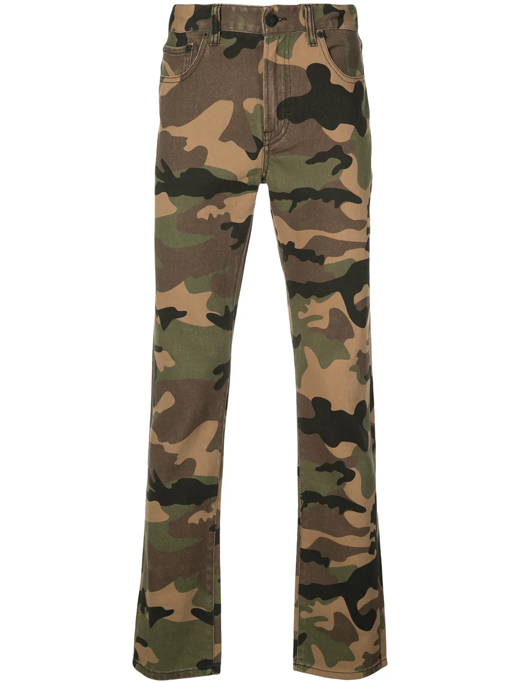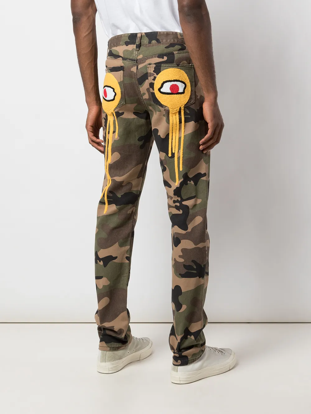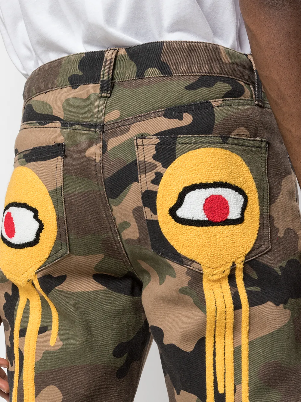 Джинсы Do You C Me? от Haculla. Средняя посадка, застежка на пуговицы, пояс с петлями для ремня, классическая пятикарманная модель, камуфляжный узор, прямые брючины и графический принт.