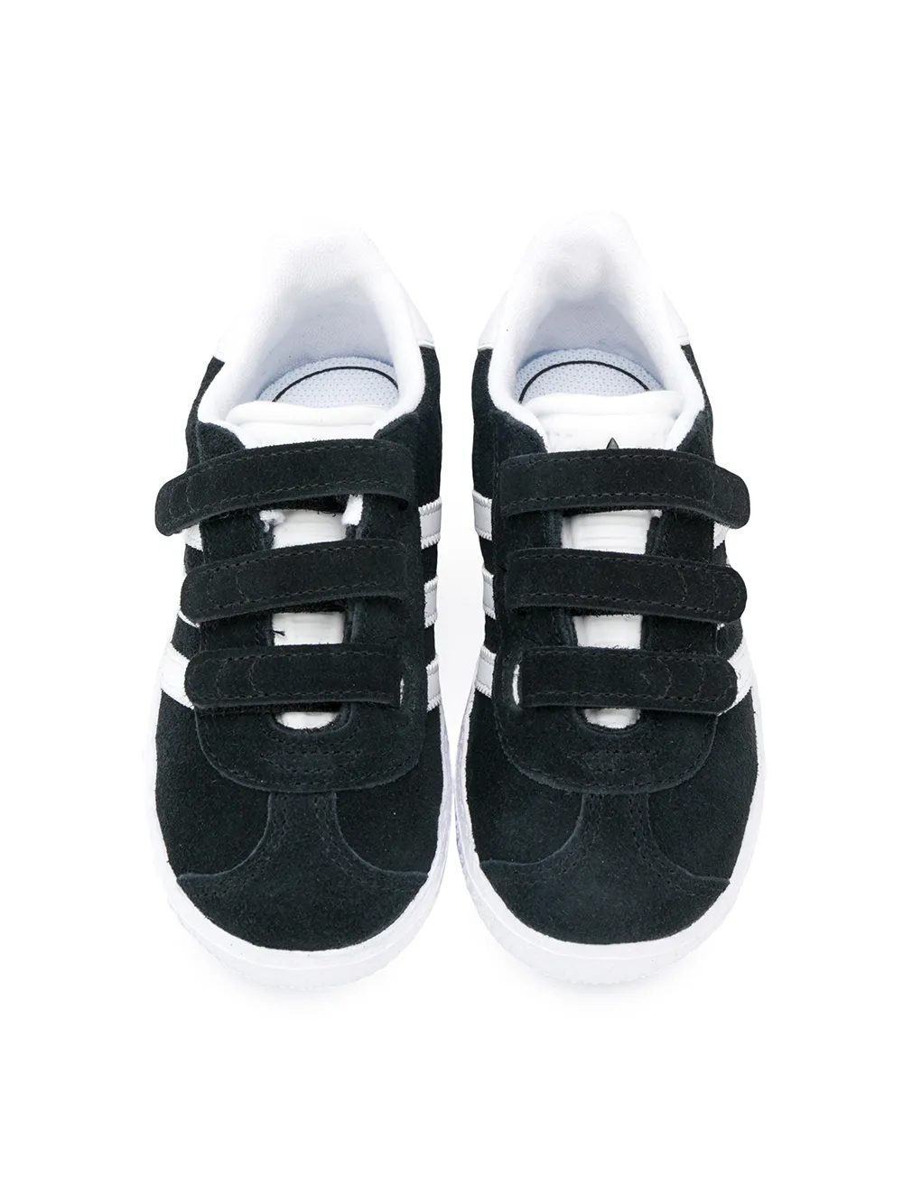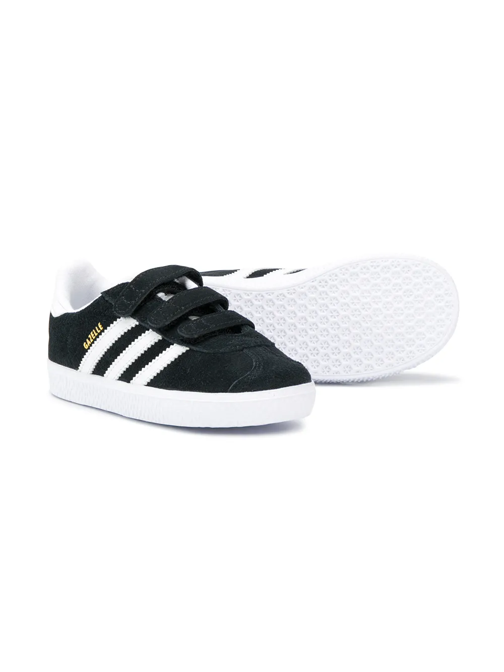 Кроссовки Gazelle от adidas Originals Kids. Закругленный носок, застежка на липучке, фирменная стелька, фирменная деталь с тремя полосками и плоская подошва. Цвет: черный.