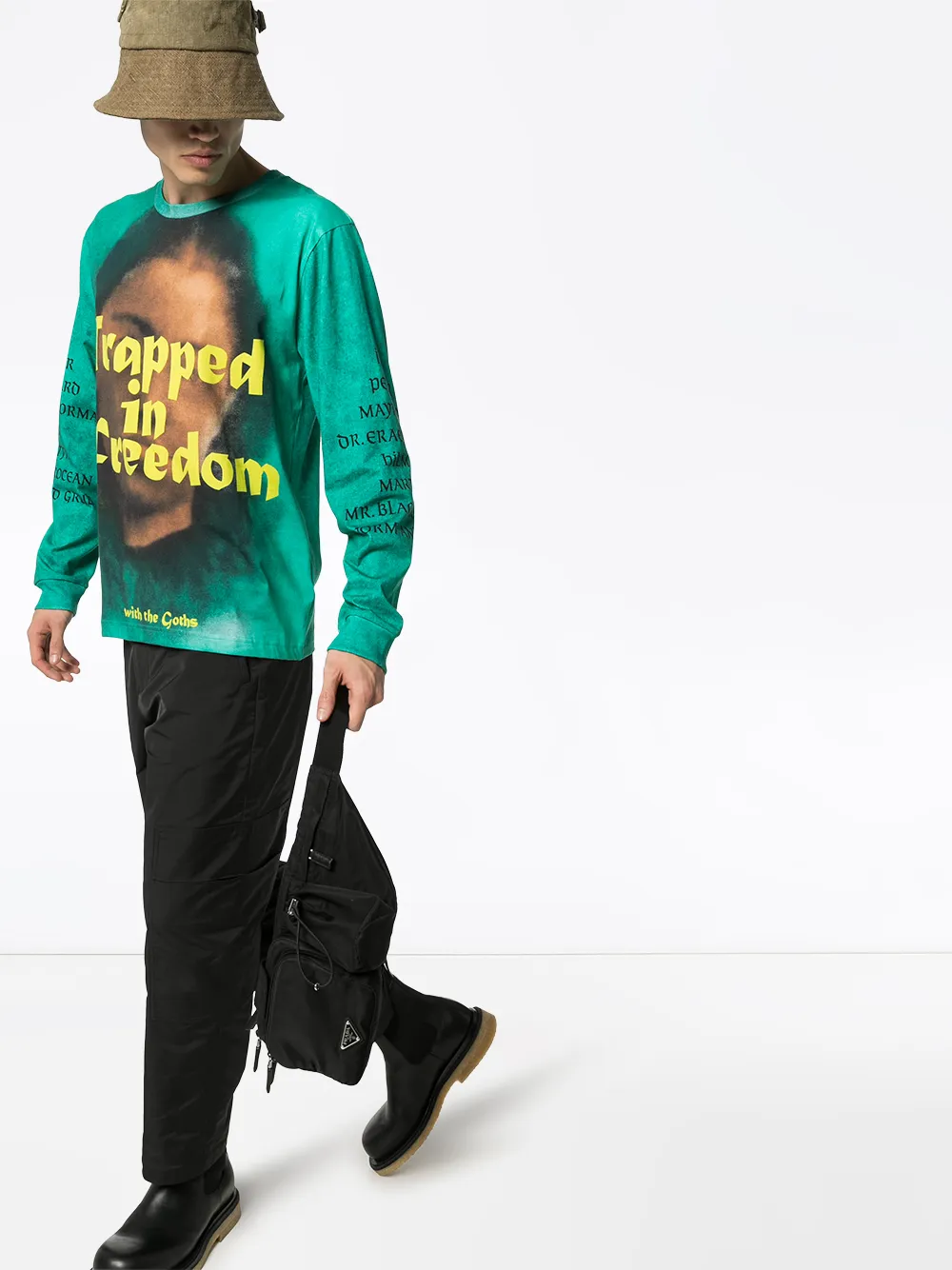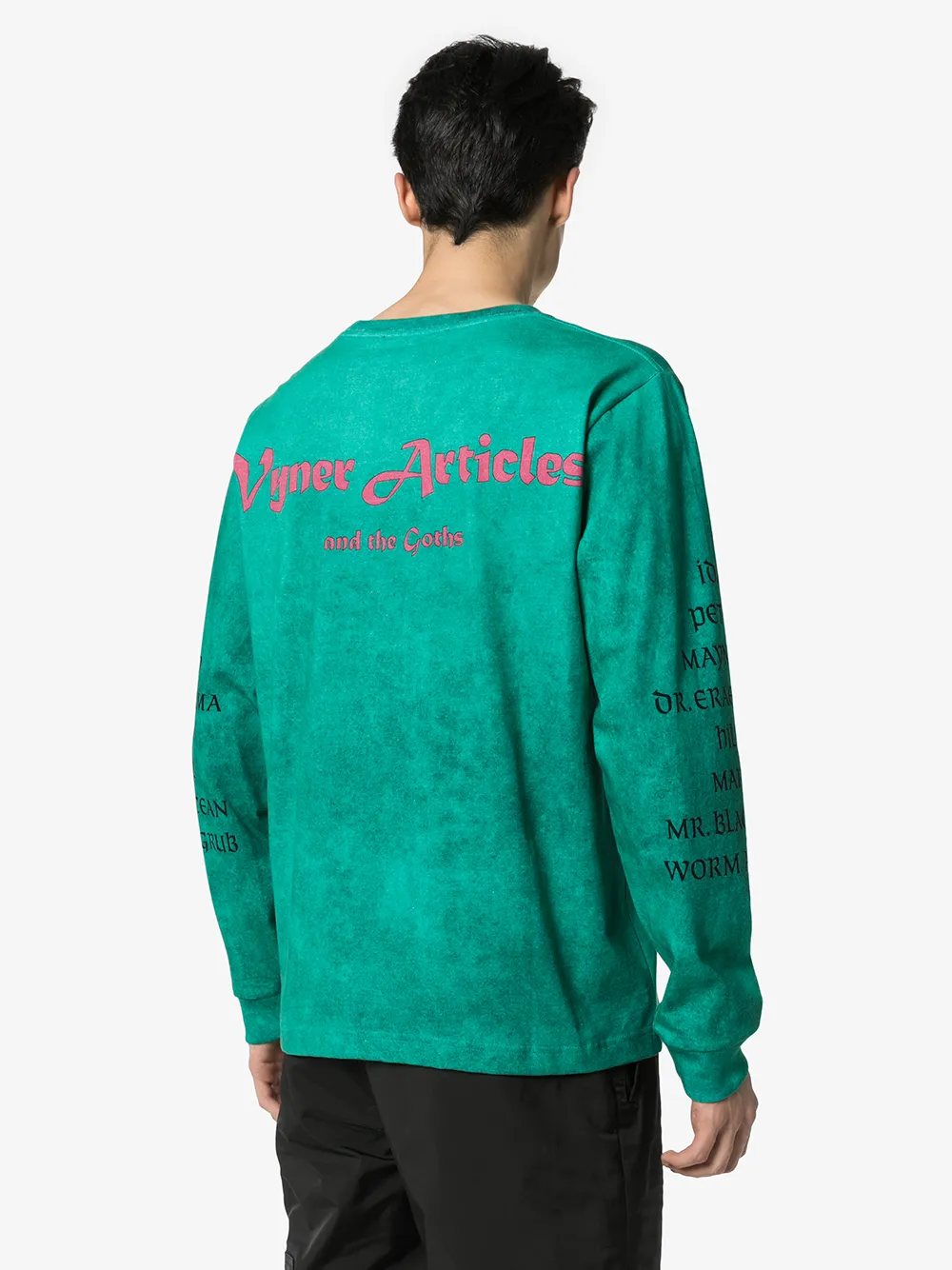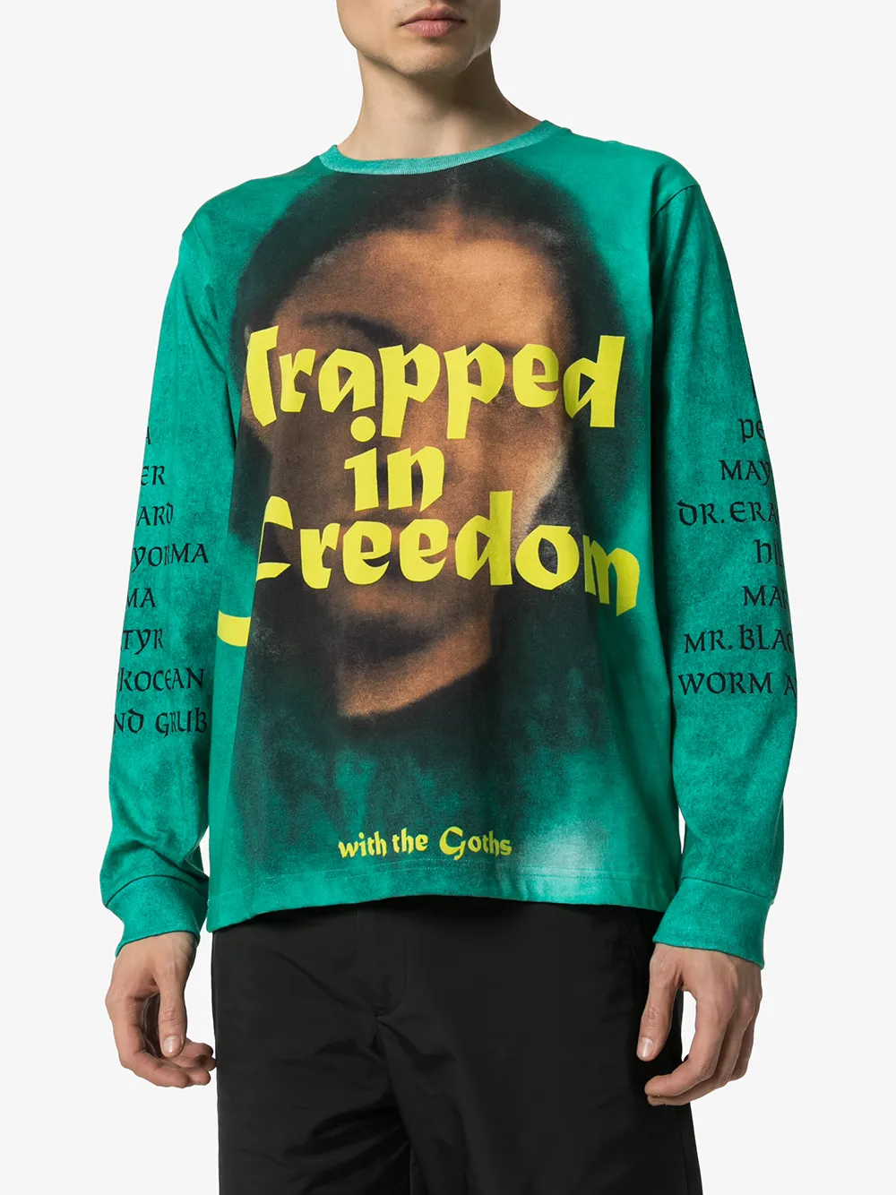 Футболка с принтом Trapped от Vyner Articles. Круглый вырез с окантовкой, графический принт, свободный крой, длинные рукава, узкие манжеты и узор сзади. Цвет: зеленый.