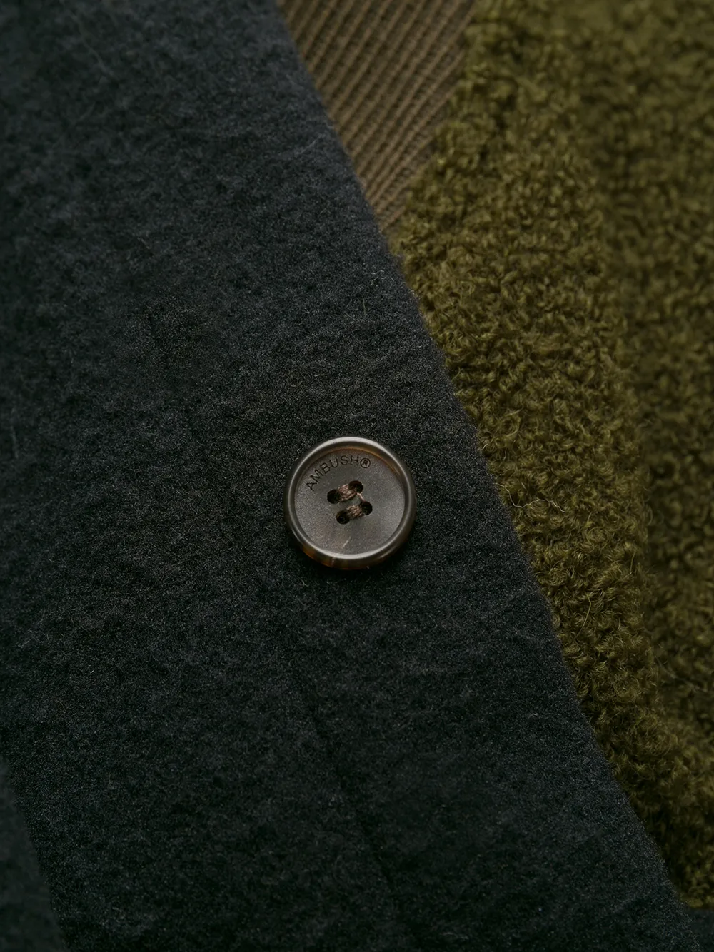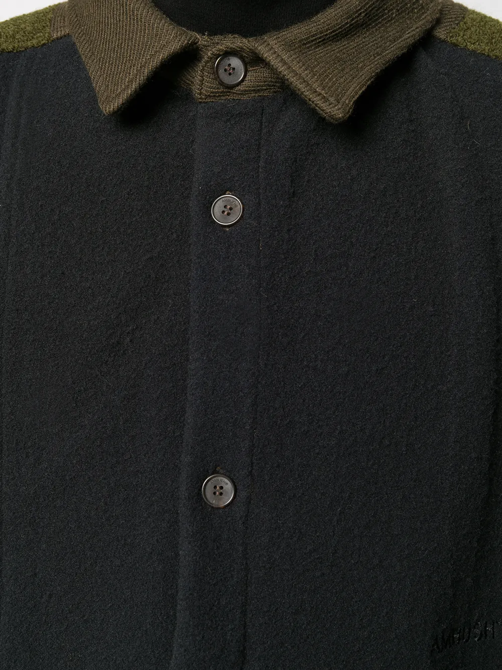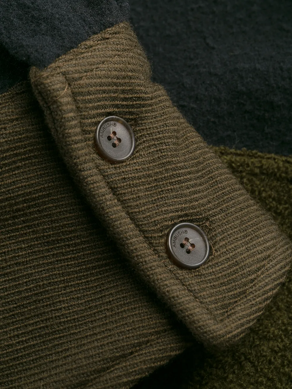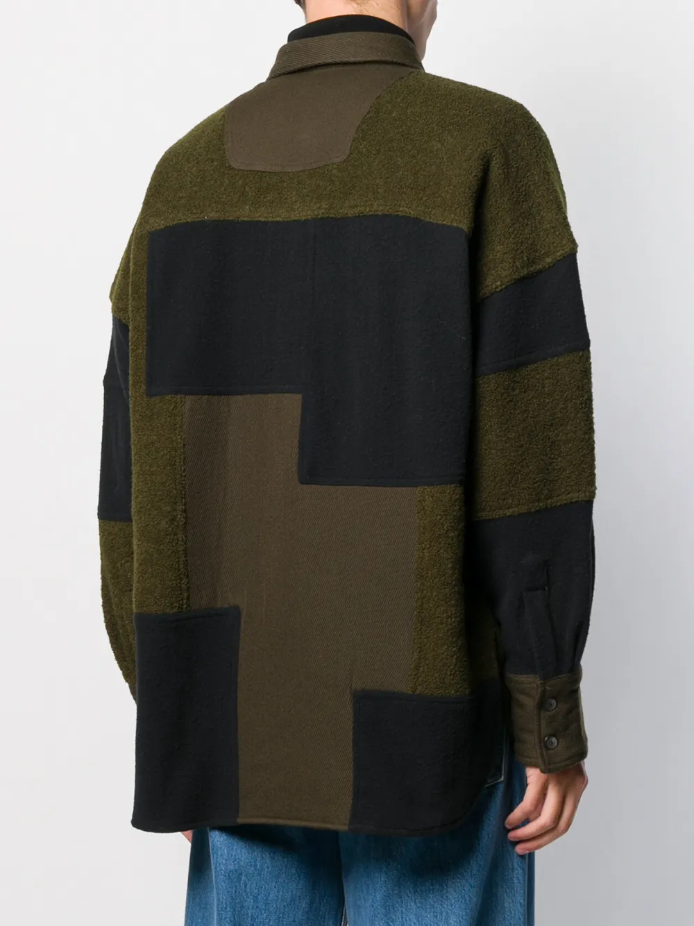 Флисовая куртка в технике пэчворк от Ambush. Классический воротник, приспущенные плечи, длинные рукава, свободный крой, застежка на пуговицах спереди и стилистика пэчворк.