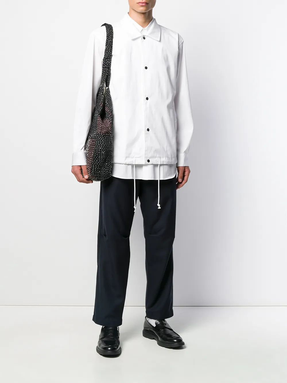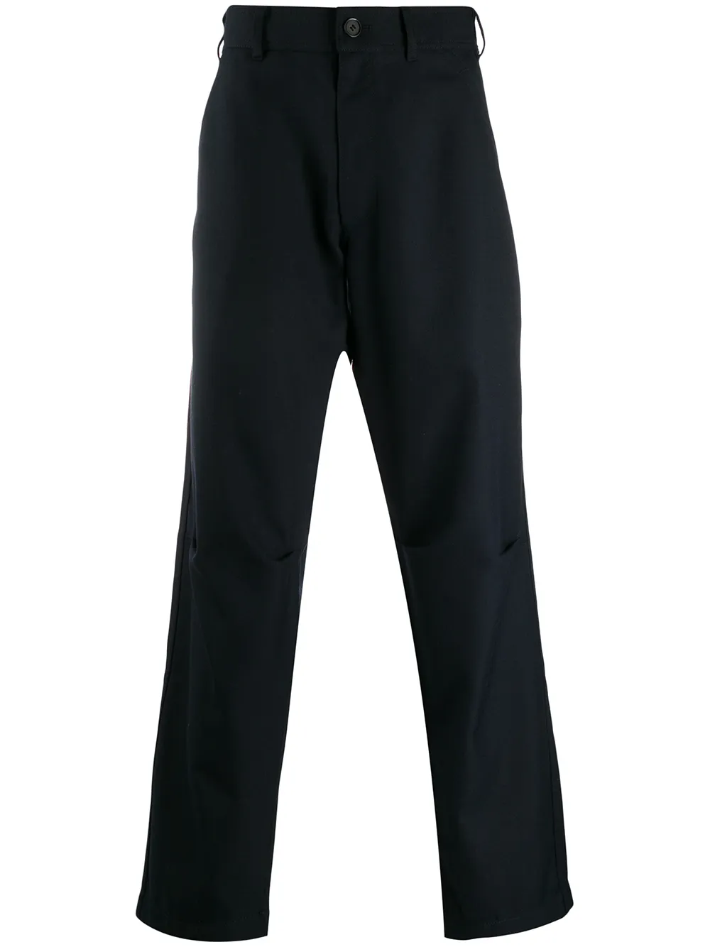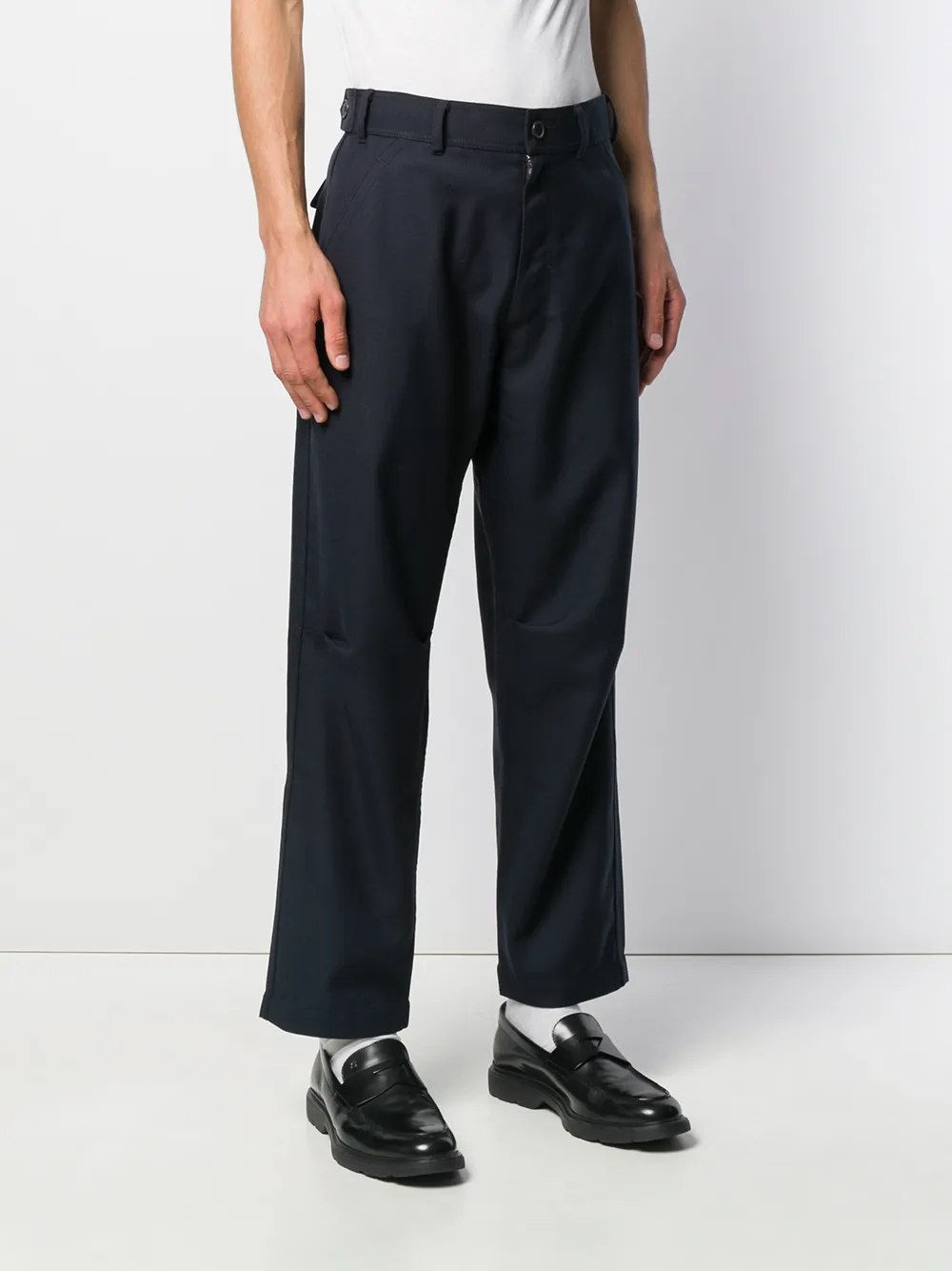 Укороченные брюки строгого кроя от Comme Des Garçons Shirt. Пояс с петлями для ремня, застежка на пуговицах спереди, задние карманы и свободный крой.
