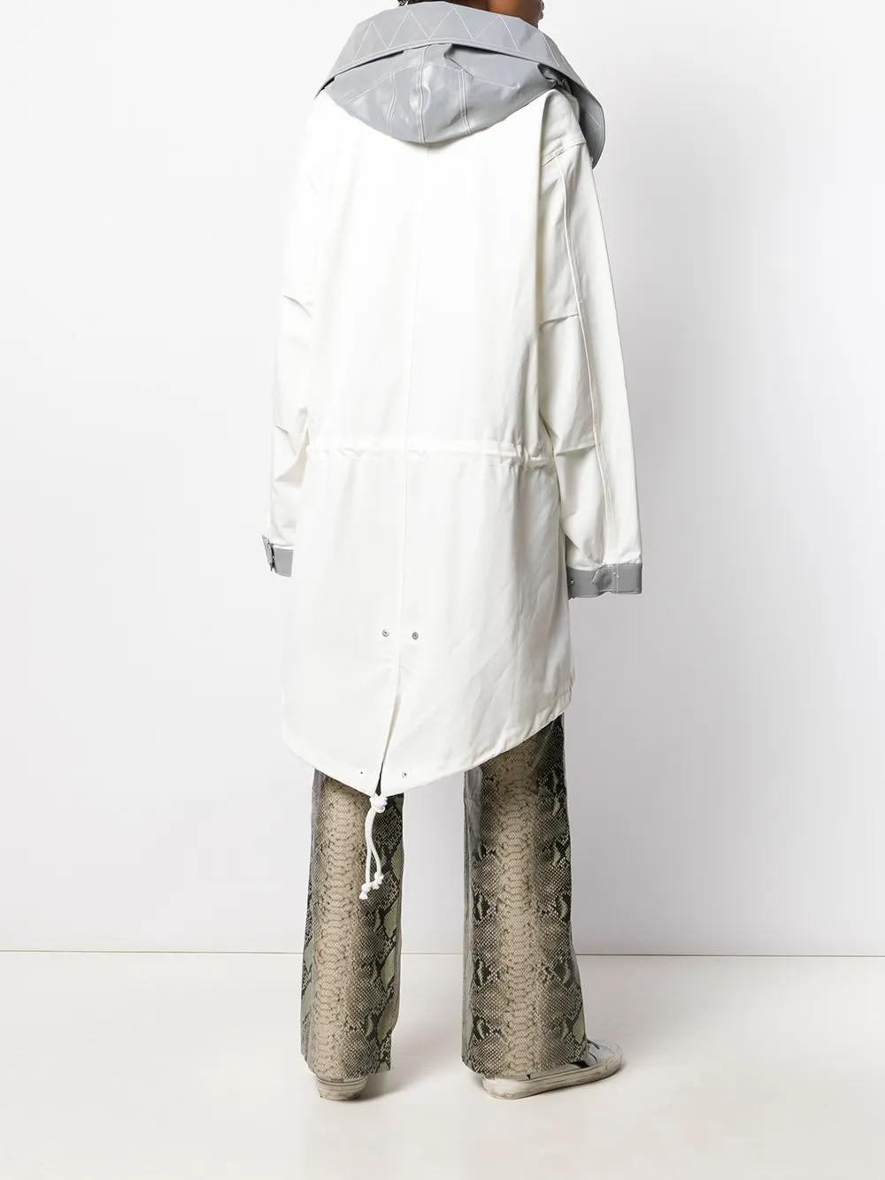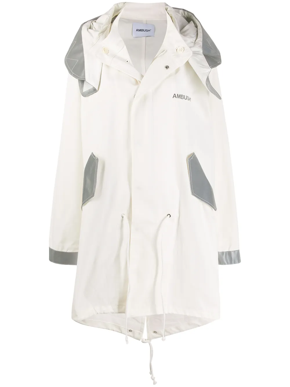 Пальто оверсайз с капюшоном от Ambush. Застежка на молнии спереди, длинные рукава, дизайн в двух тонах, передние карманы с клапанами и свободный крой. Цвет: белый.