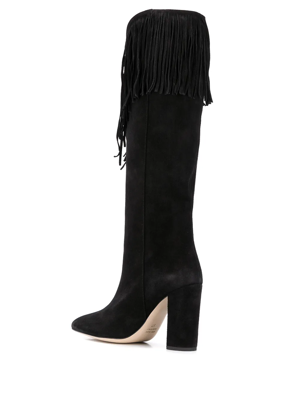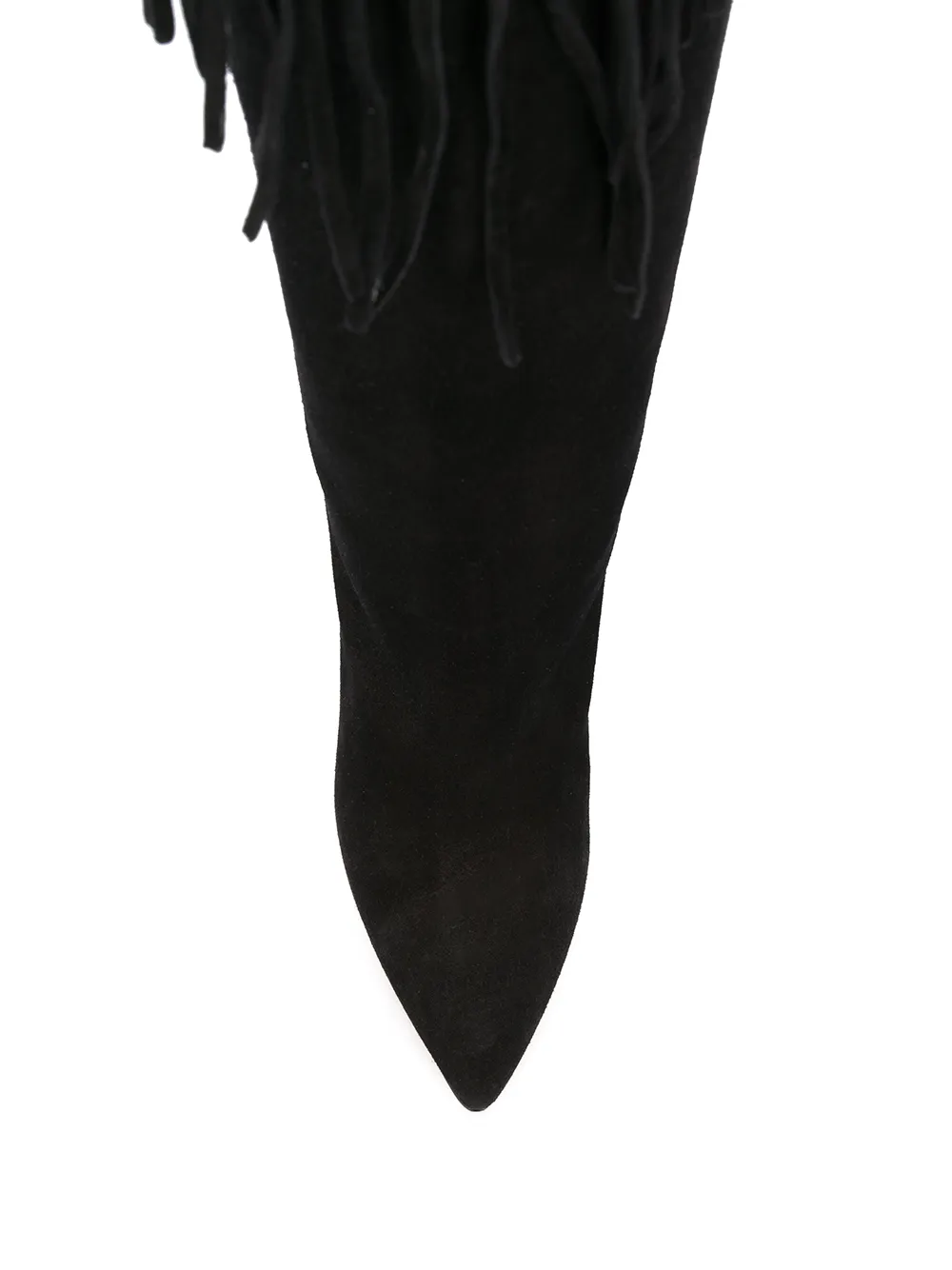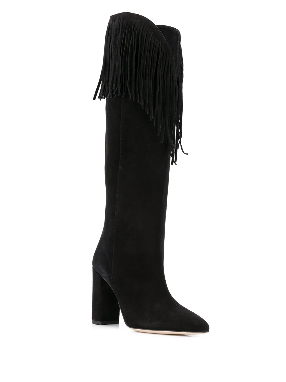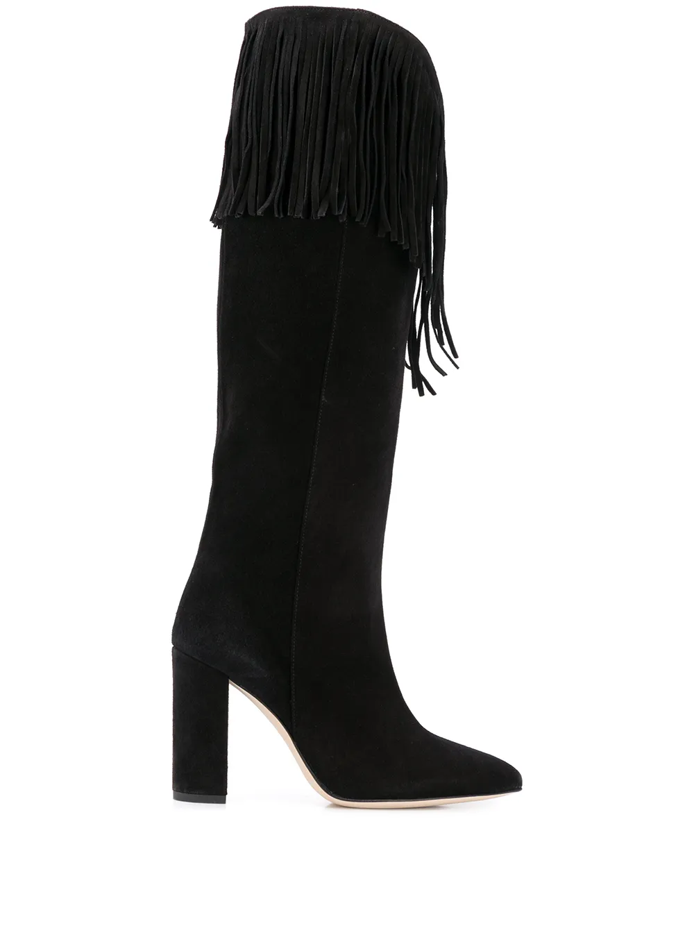 Сапоги с бахромой от Paris Texas. Модель без застежки, края с бахромой, прошитые панели, массивный высокий каблук, заостренный носок и кожаная подошва. Цвет: черный.