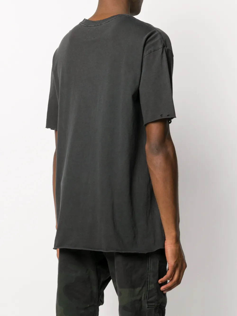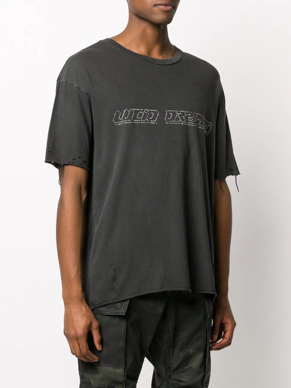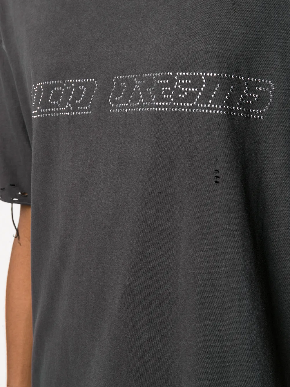 Футболка с эффектом потертости от Alchemist. Круглый вырез, короткие рукава, украшение из кристаллов и неровный необработанный подол. Цвет: черный.