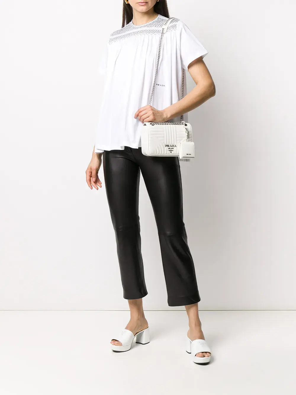 Дополните свой образ элегантной белой футболка с контрастной строчкой от Prada. Она выполнена из эластичного хлопка и имеет свободный силуэт. Лучше всего она будет смотреться в комплекте с джинсами с завышенной талией. Модель имеет круглый вырез, шнуровку, декоративную строчку, логотип, короткие рукава и свободный крой.