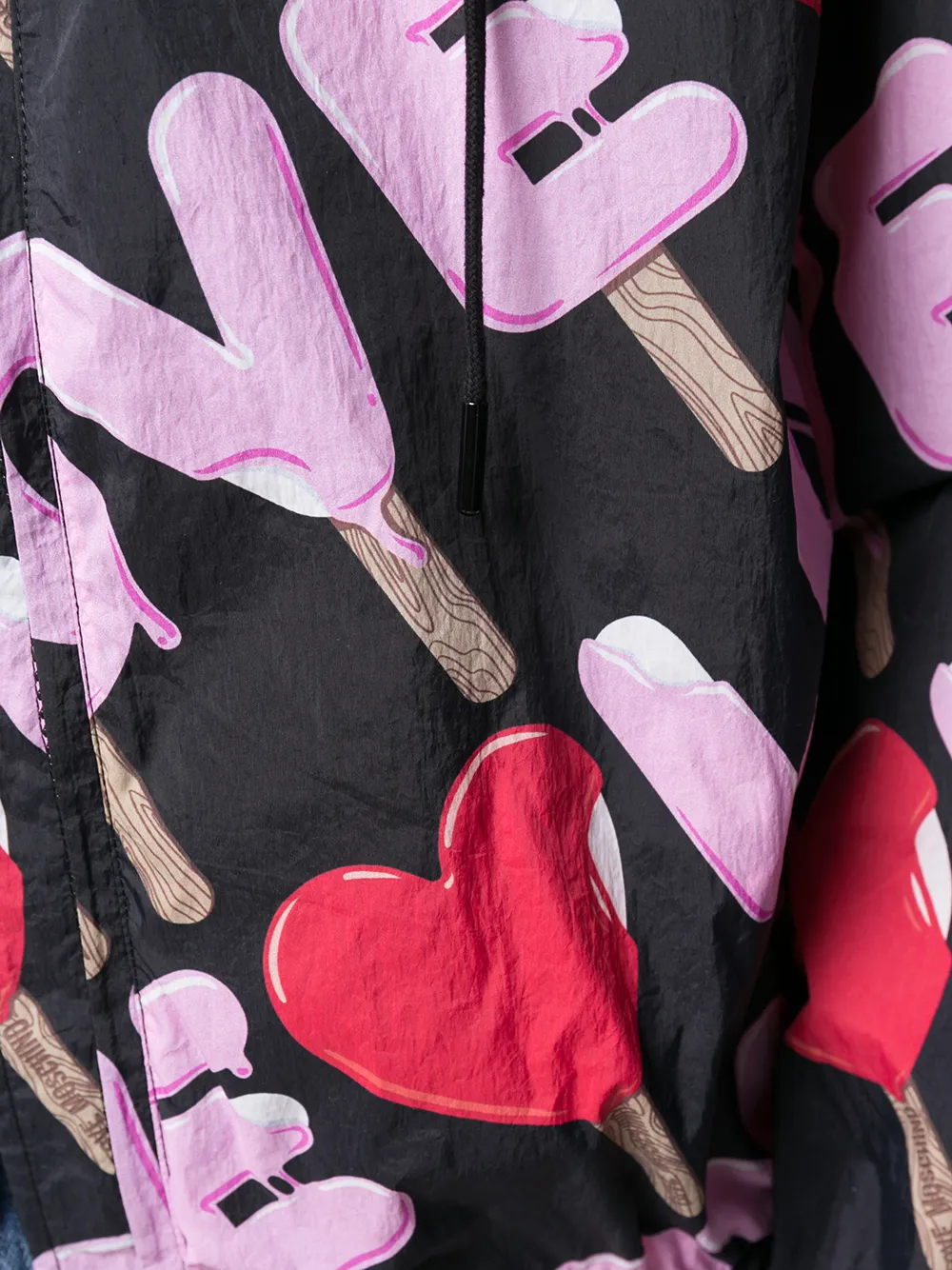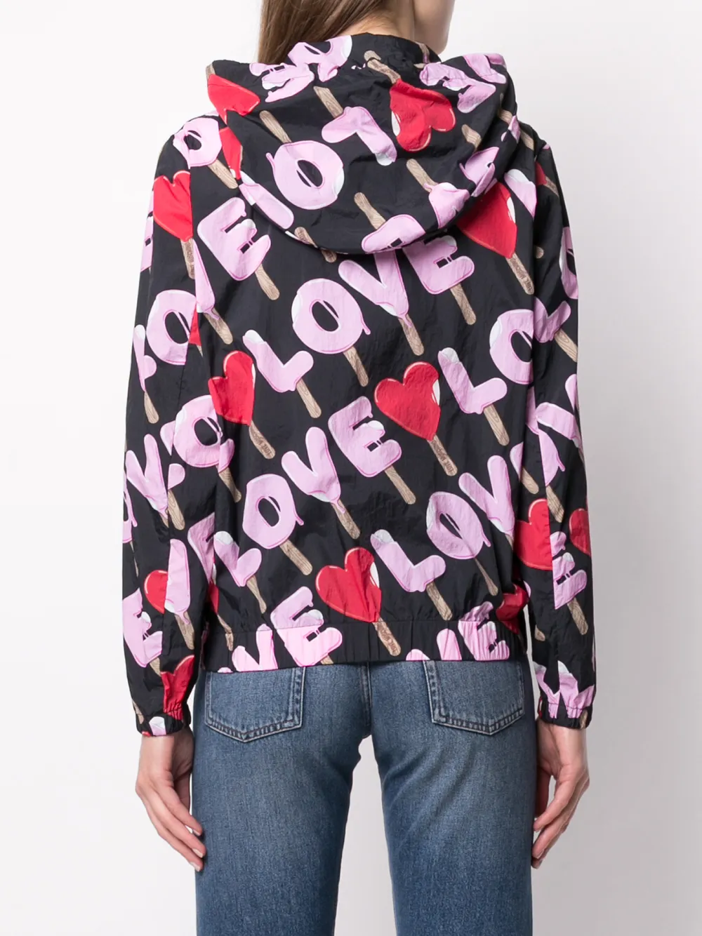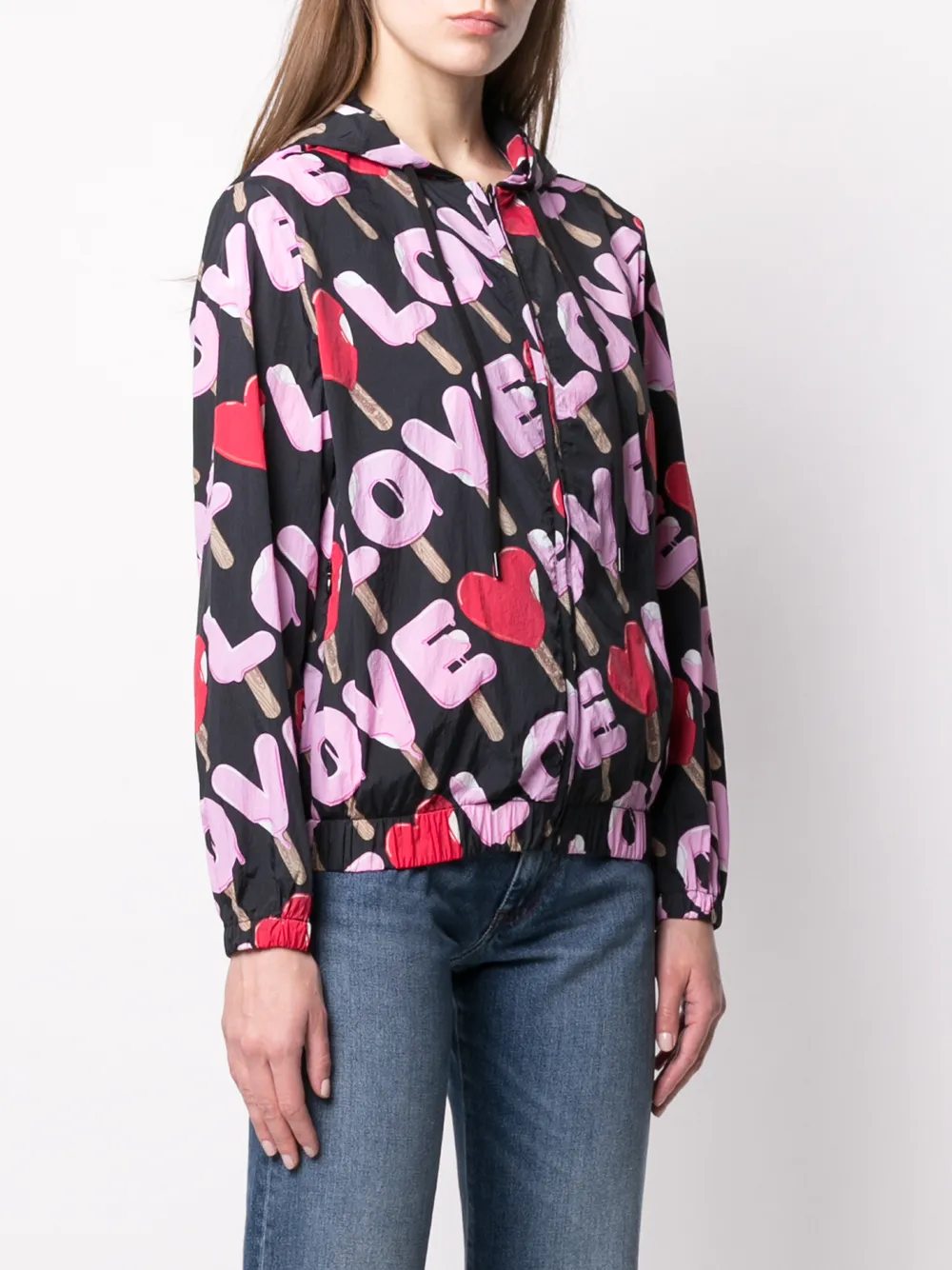 Куртка с принтом от Love Moschino (Лав Москино). Капюшон, затягивающийся на шнурок, застежка на молнии спереди, длинные рукава, эластичный подол и эластичные манжеты. Цвет: черный.