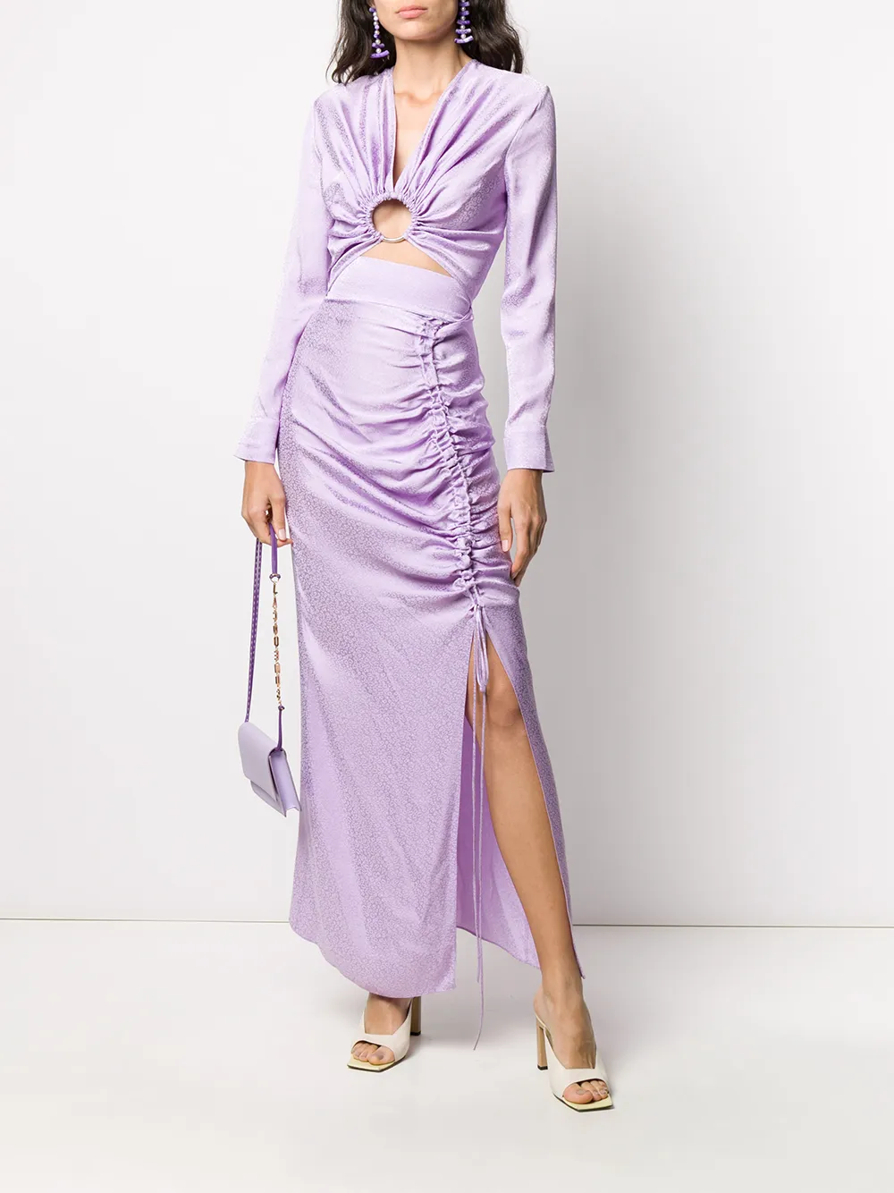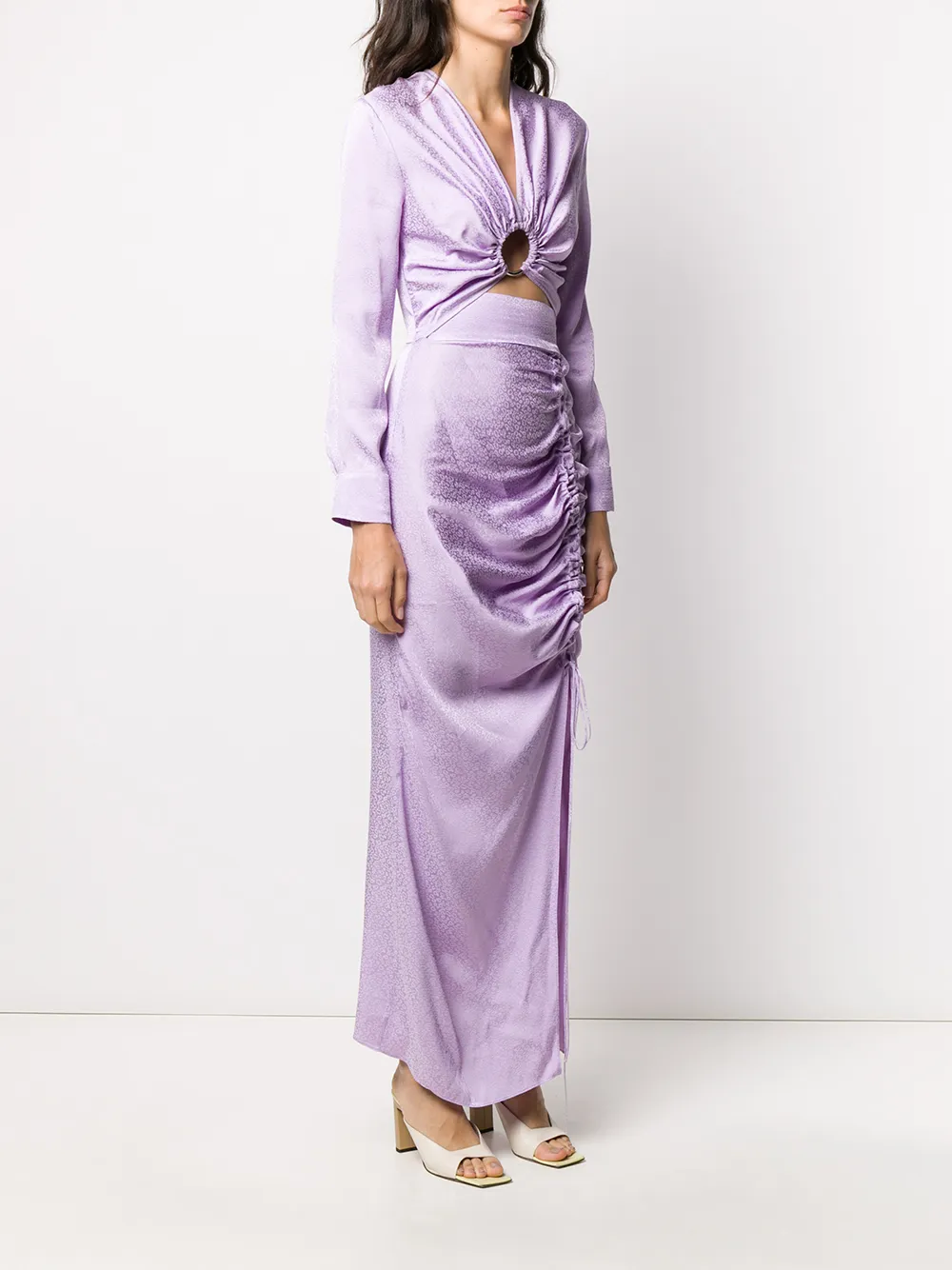 Платье со сборками и длинными рукавами от Matériel. Глубокий V-образный вырез, вырезные детали, удлиненная модель, боковой разрез и прямой подол.