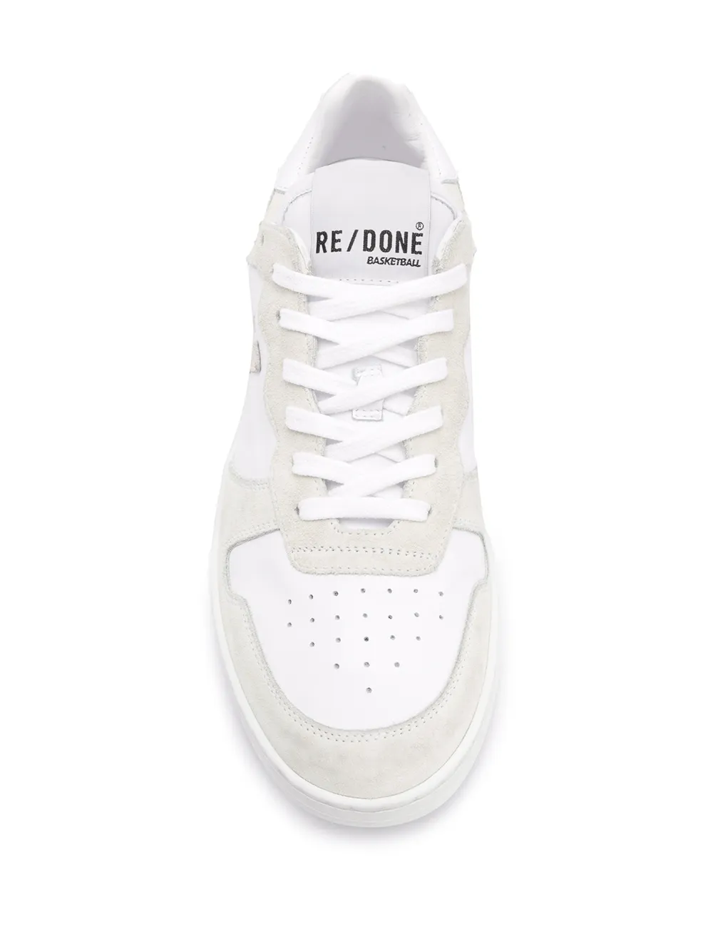 Двухцветные кроссовки от RE/DONE. Замшевые панели, перфорированная деталь, закругленный носок, шнуровка спереди, заплатка с логотипом на язычке, фирменная стелька и плоская резиновая подошва.