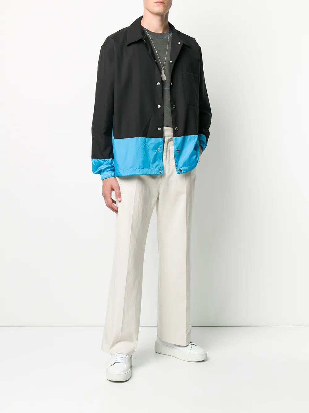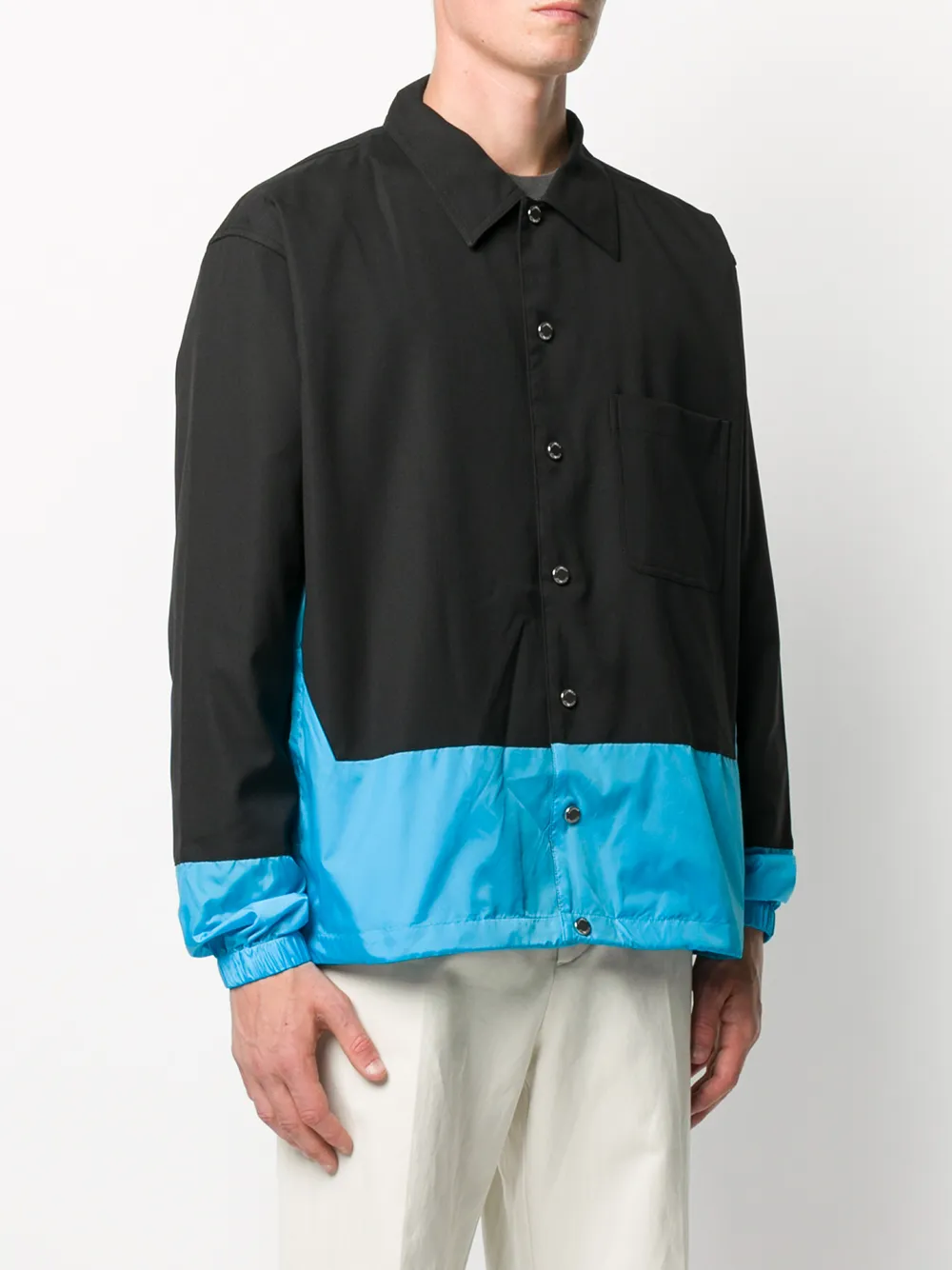 Сочетание двух оттенков, классический воротник, застежка на кнопках спереди, длинные рукава и накладной карман спереди.