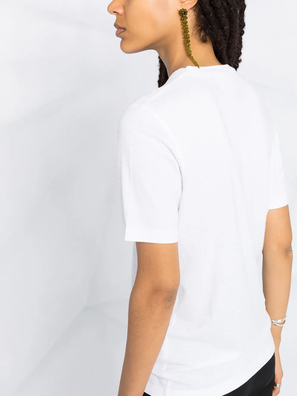 Принт с логотипом на груди, круглый вырез, короткие рукава, прямой подол и украшение из поделочных камней.