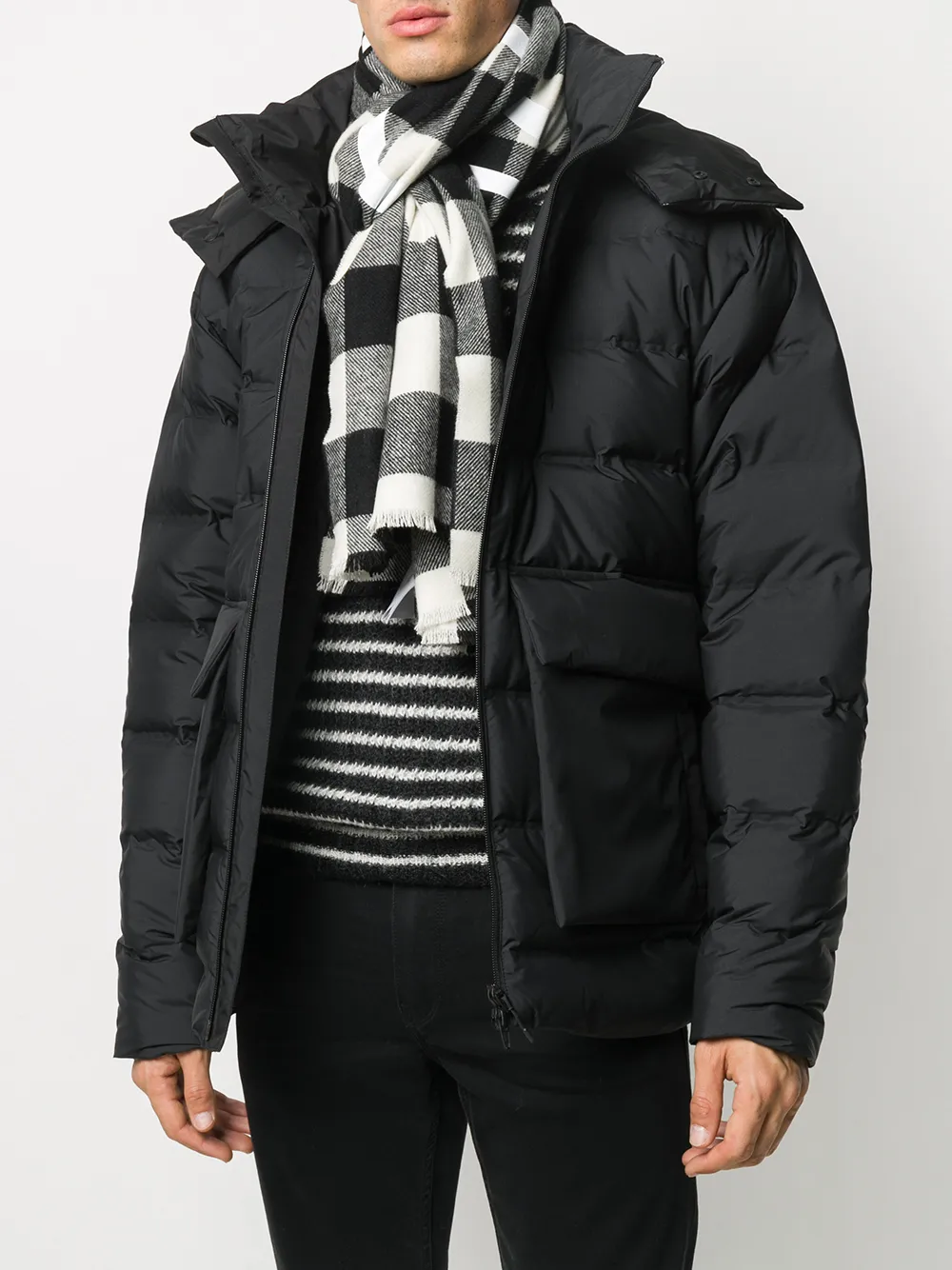 Логотип спереди, клетчатый узор и необработанные края.