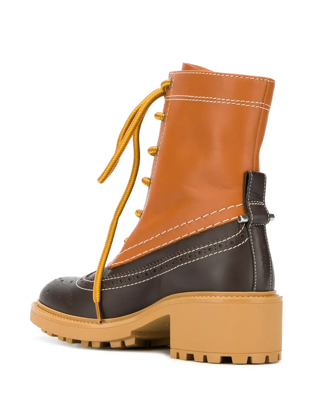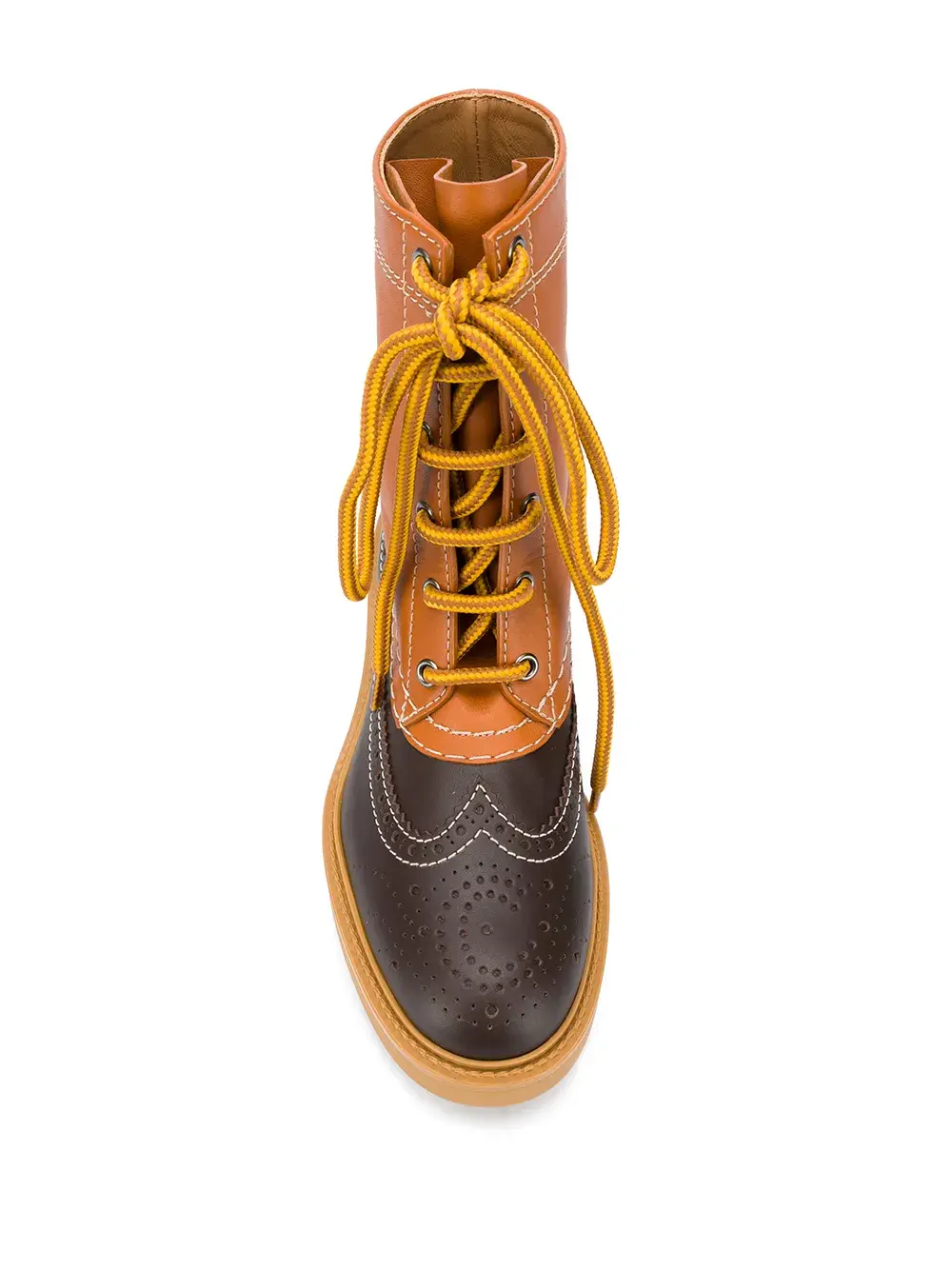 Закругленный носок, наборный каблук средней высоты, шнуровка спереди, перфорация, длина по щиколотку и контрастная строчка.