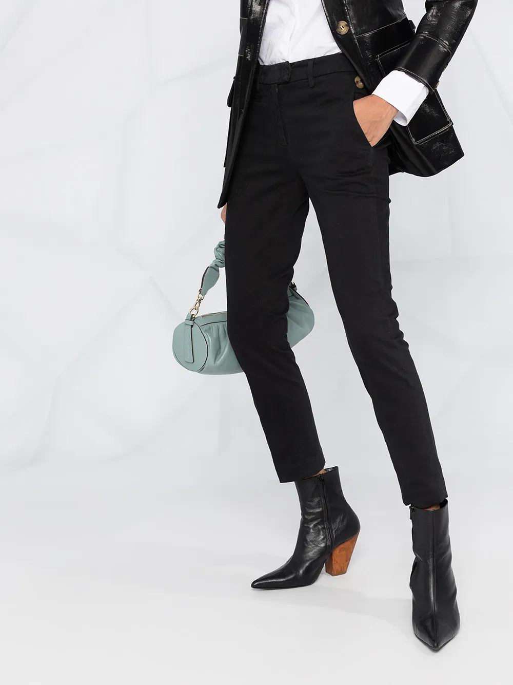 Петли для ремня, потайная молния спереди, отделение для монет, два вшитых кармана по бокам, два кармана с листочкой сзади и узкий крой. Цвет: черный.
