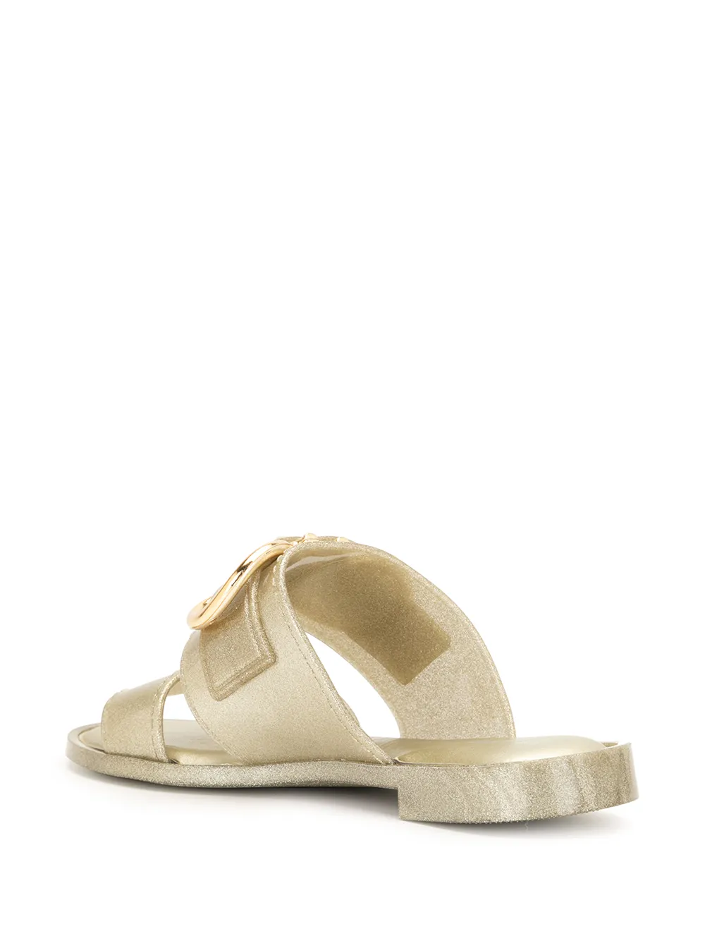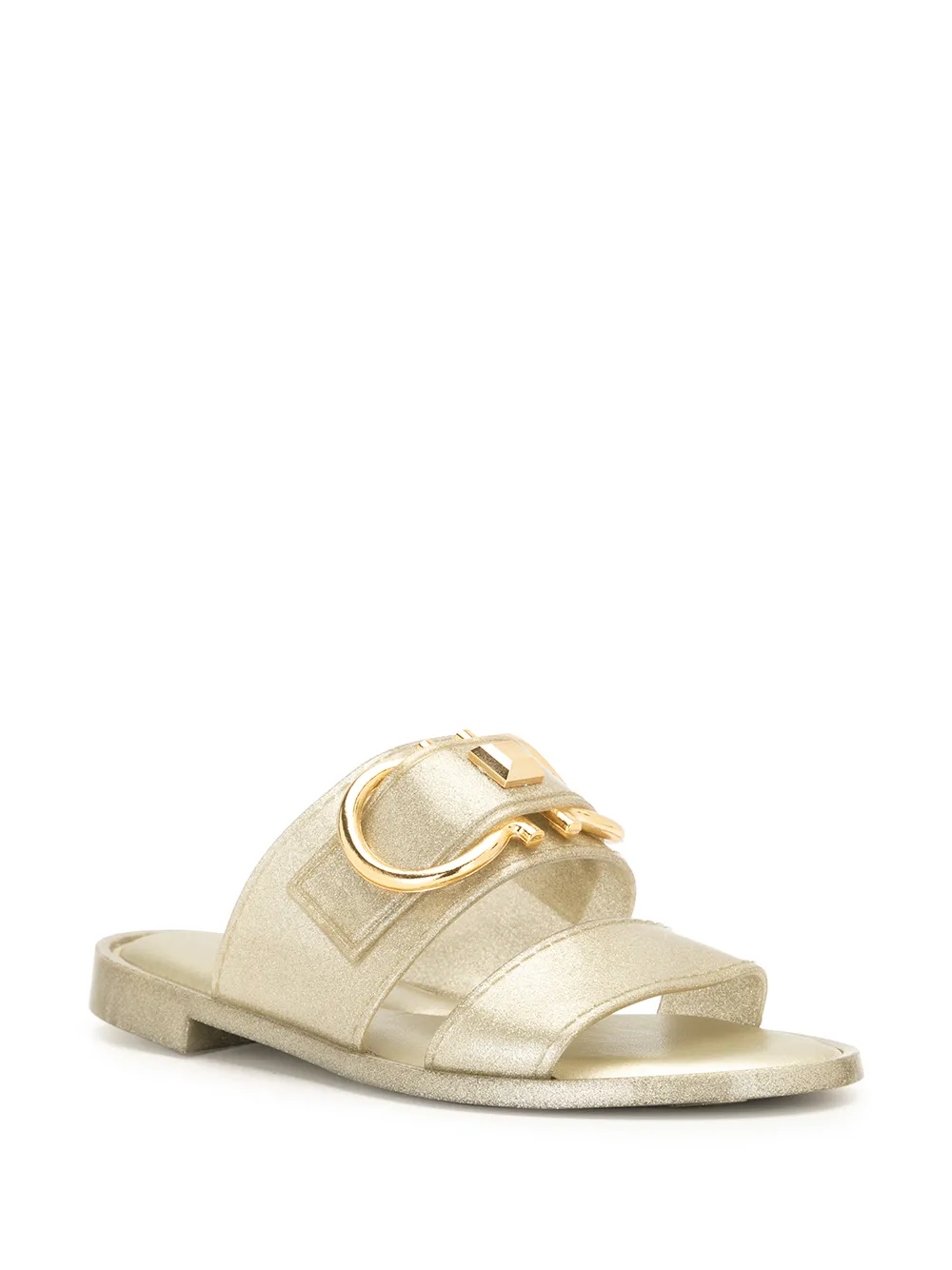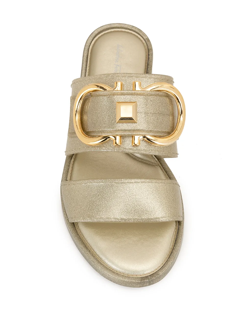 Пряжка Gancini, золотистая фурнитура, эффект металлик, открытый носок, закругленный носок, модель без застежки, стелька с логотипом и плоская подошва.