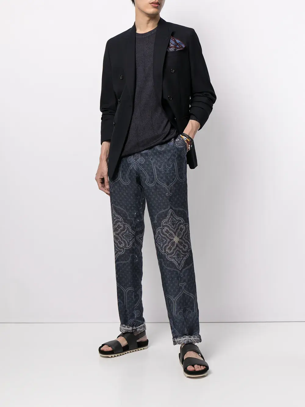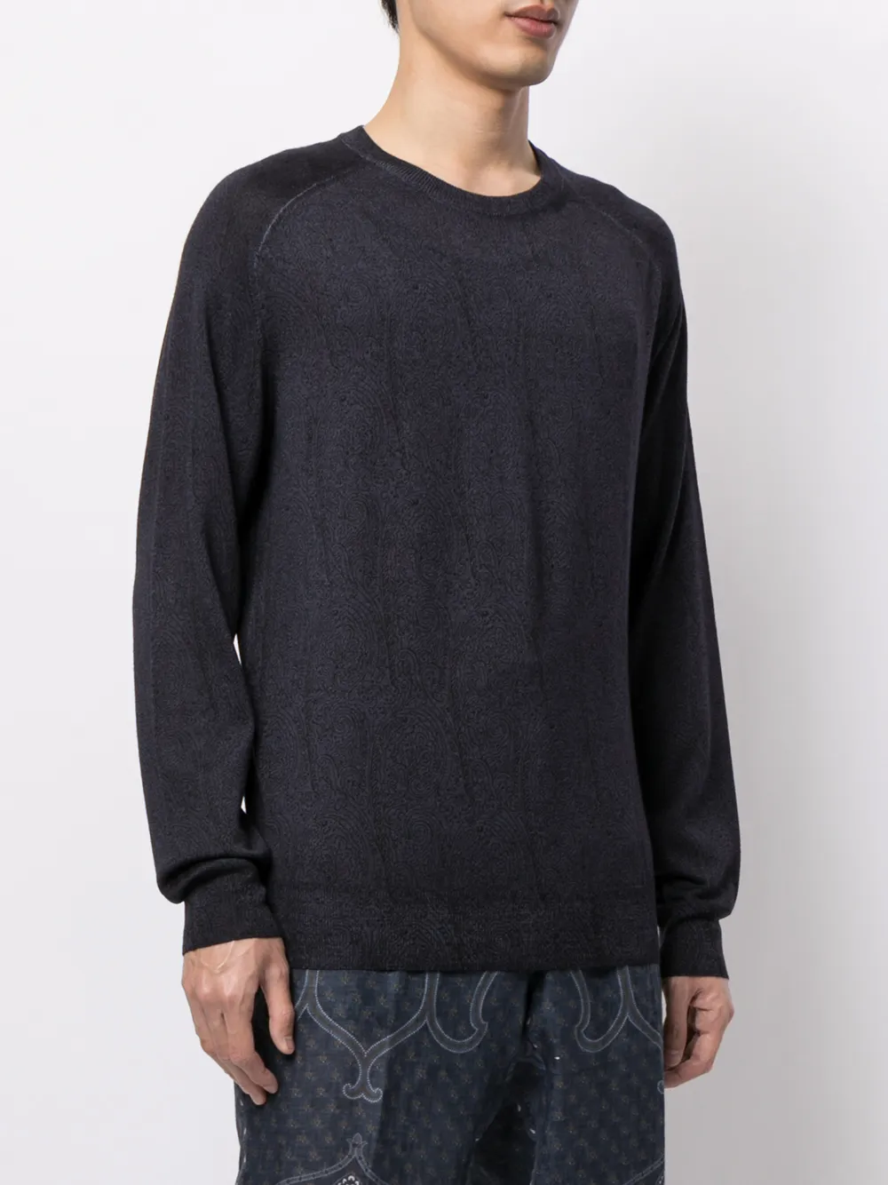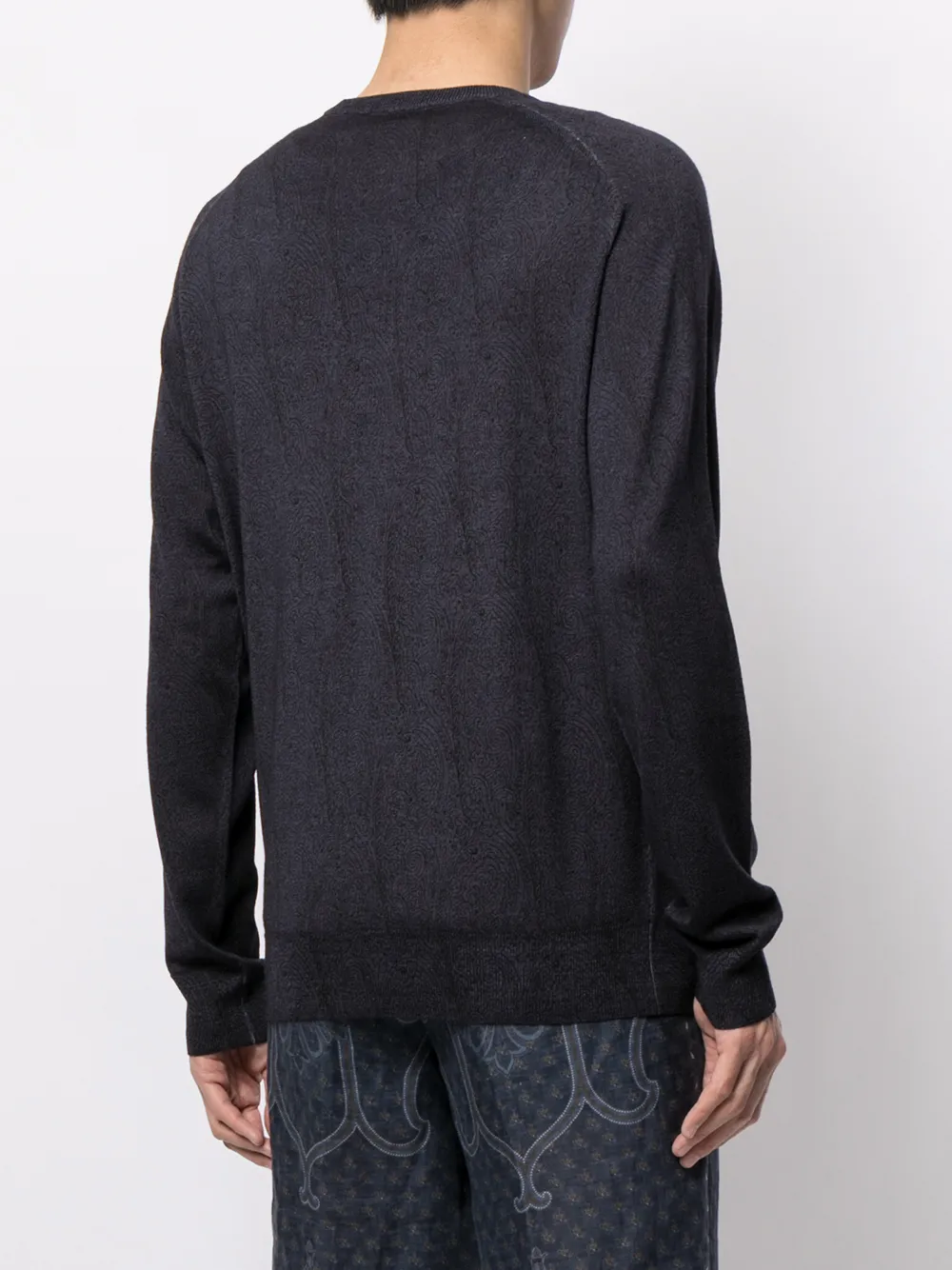 Крупная вязка, круглый вырез, длинные рукава и прямой подол.
