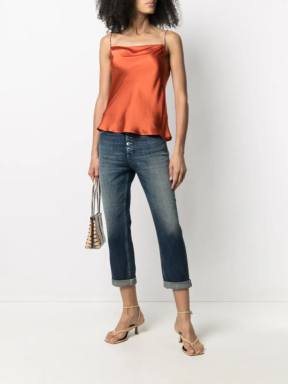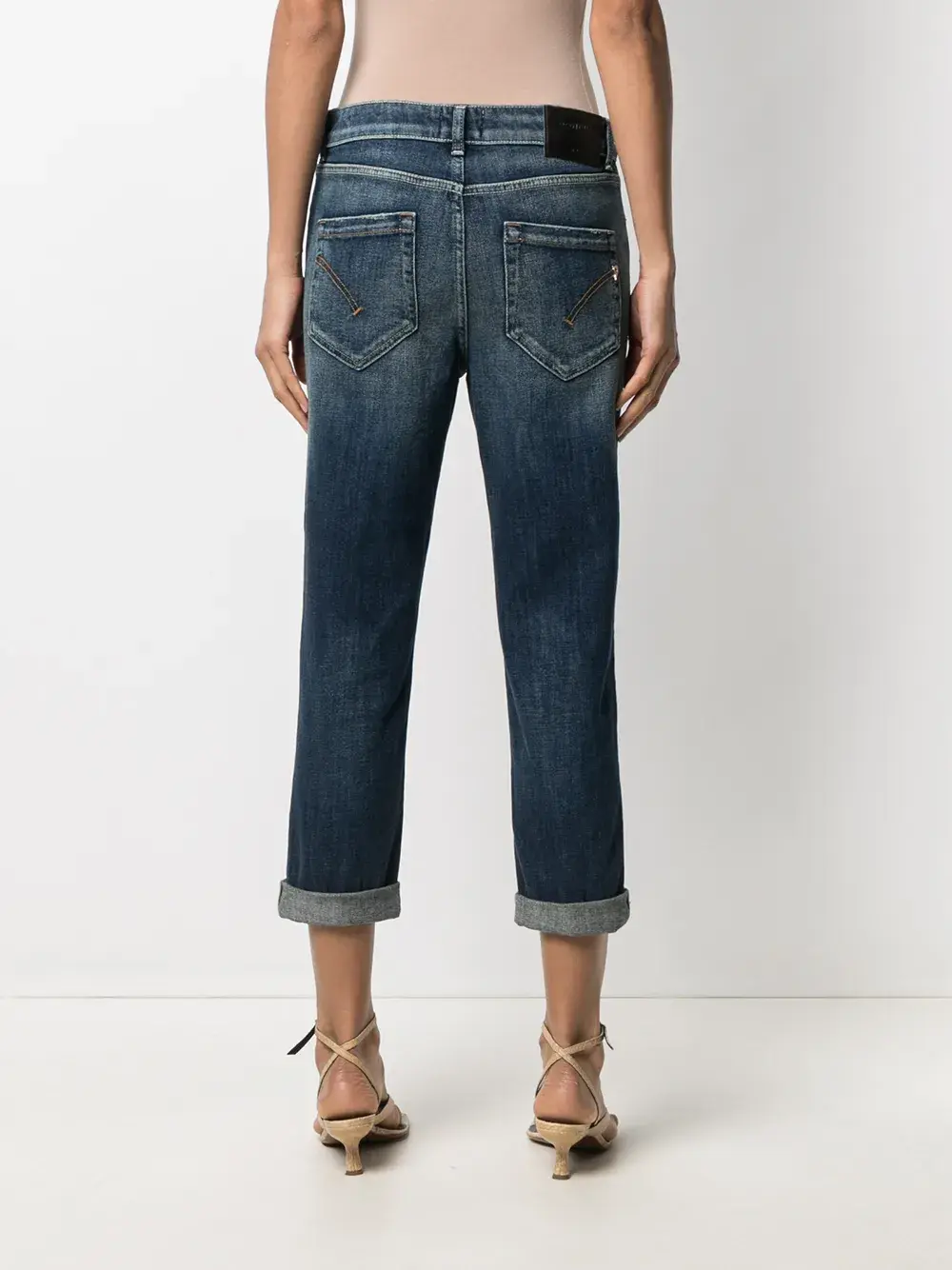 Средняя посадка, петли для ремня, классическая пятикарманная модель, застежка на пуговицы, укороченная длина и эффект потертости. Цвет: синий.