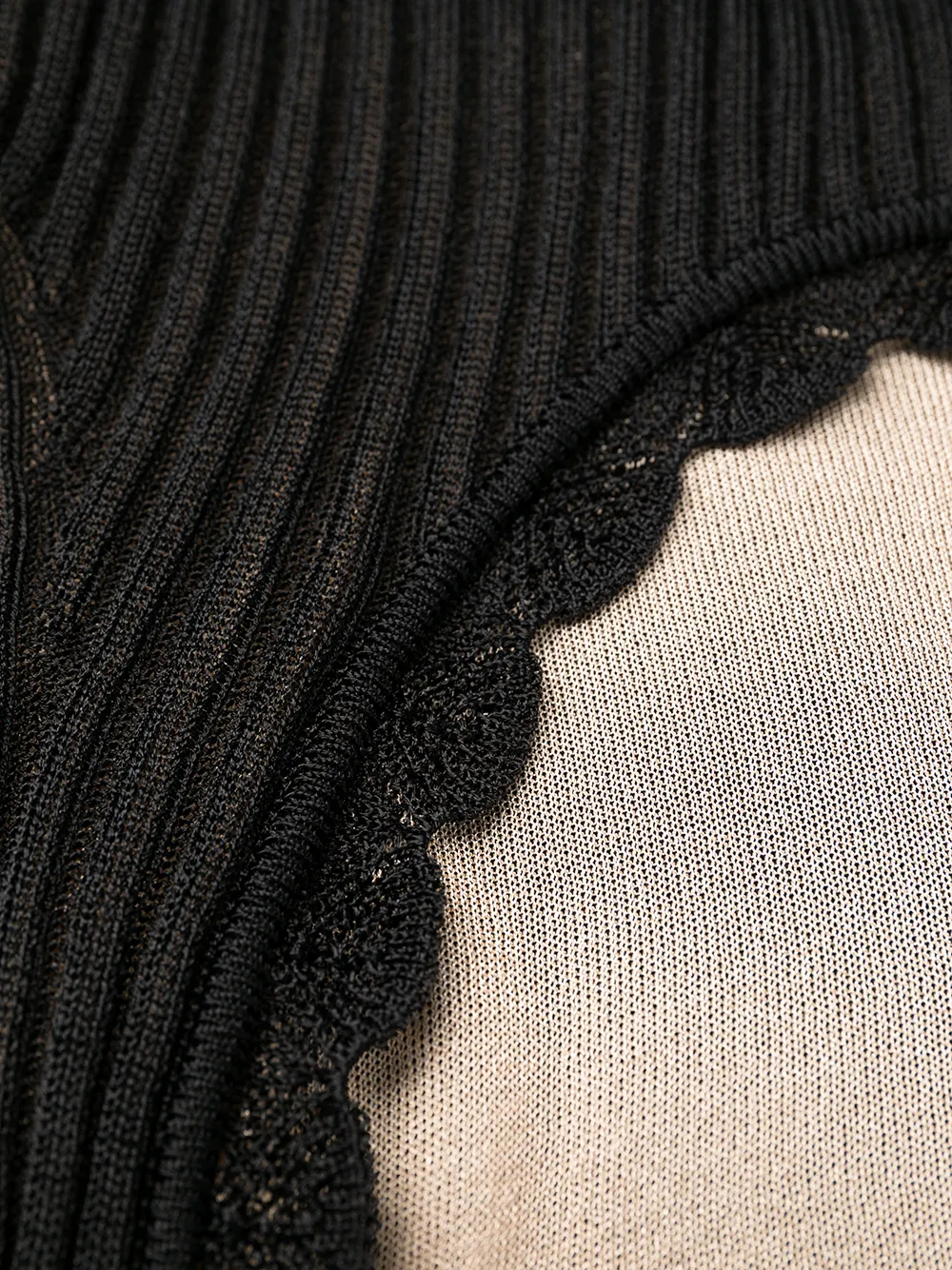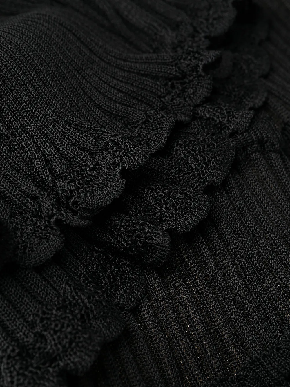 Ткань в мелкий рубчик, воротник с фестонами, края с фестонами, U-образный вырез и короткие рукава. Цвет: черный.