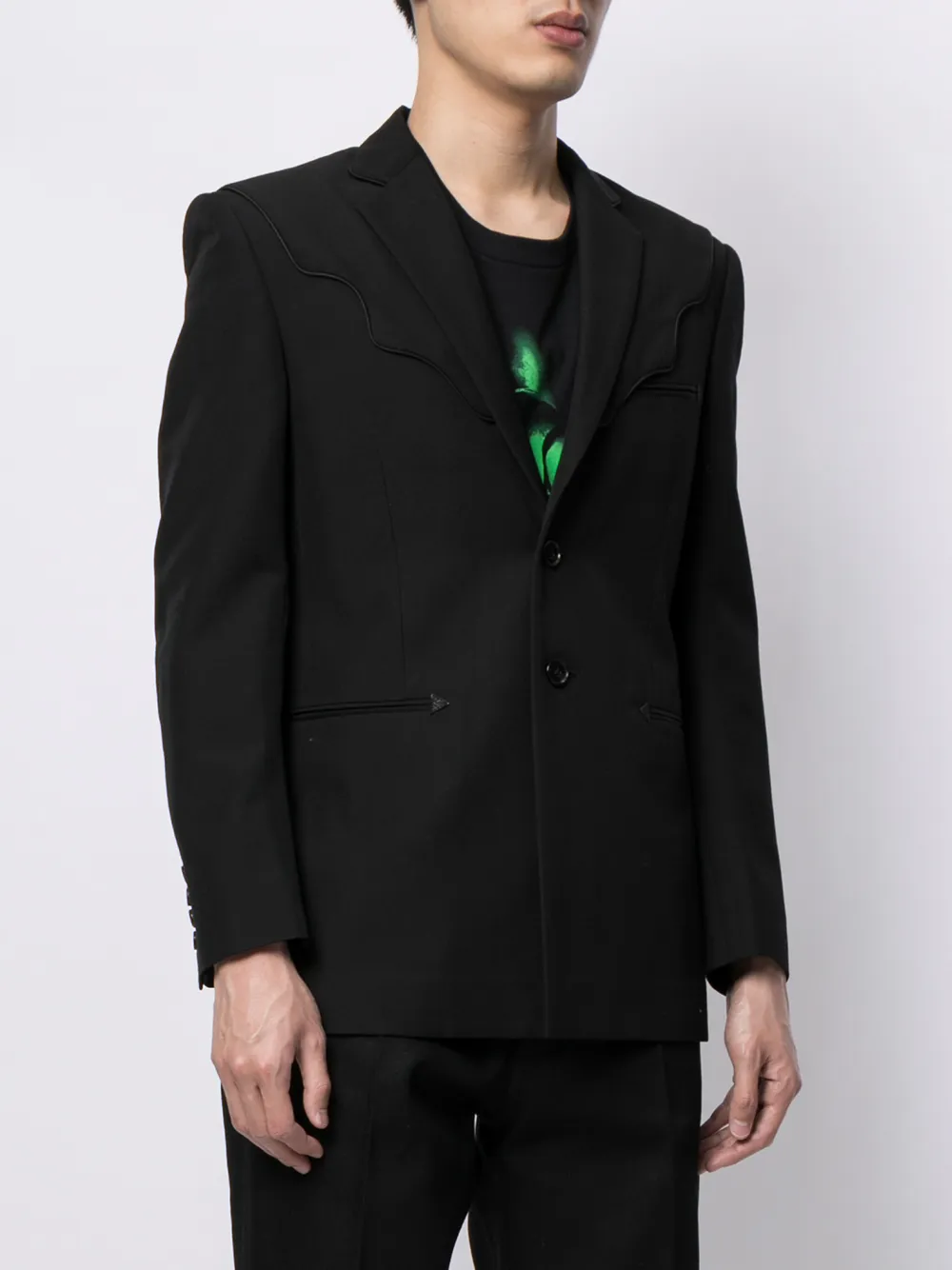 Многослойная деталь, зазубренные лацканы, застежка на пуговицах спереди, длинные рукава, манжеты на пуговицах, два передних кармана с листочкой и шлица по центру сзади. Цвет: черный.