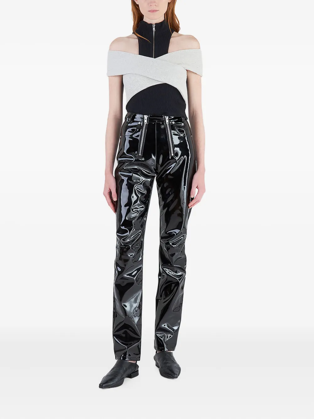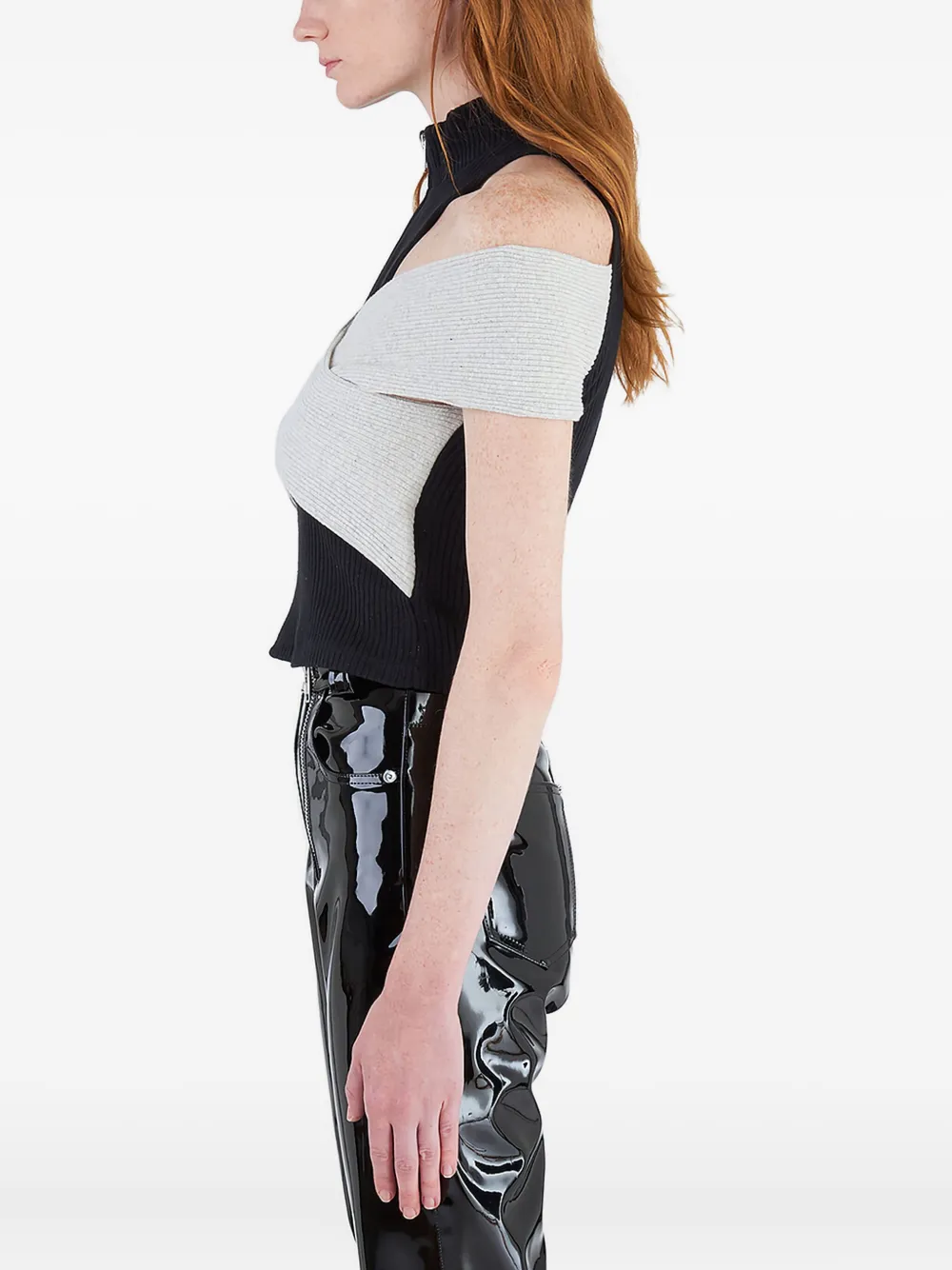 Серый вязаный в рубчик высокий ворот открытые плечи короткие рукава многослойный дизайн