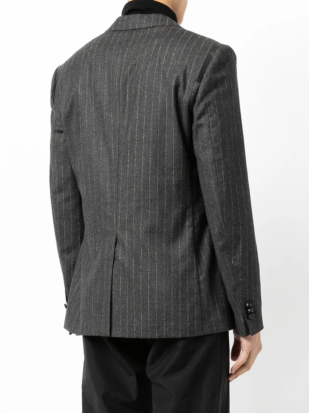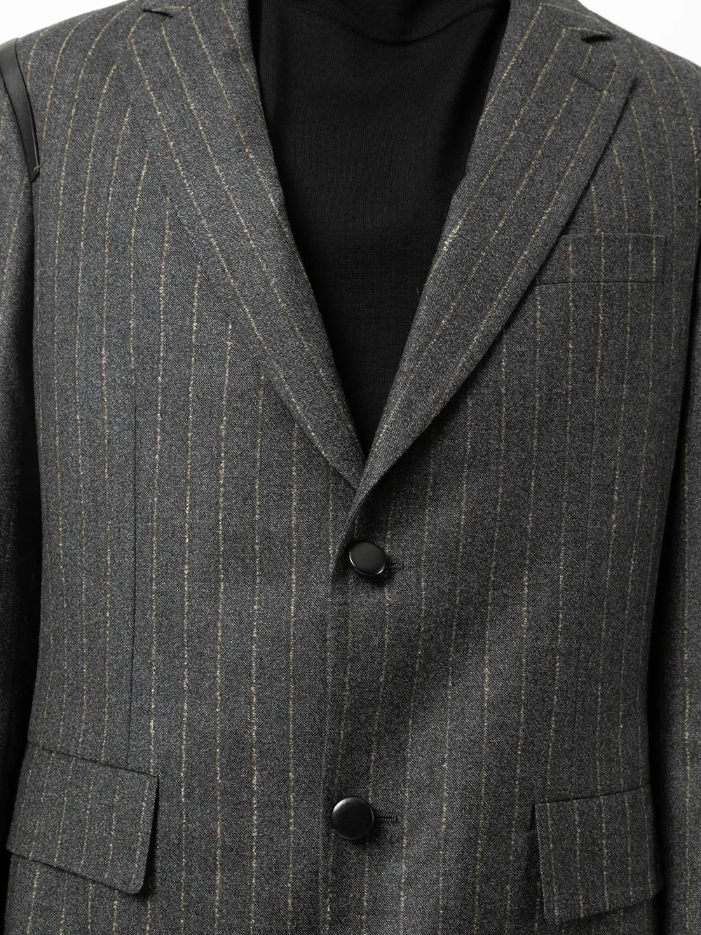 Принт в тонкую полоску, кожаная отделка, застежка на пуговицах спереди, передние карманы с клапаном, прорезной карман на груди, длинные рукава, манжеты на пуговицах, шлица по центру сзади и прямой подол. Цвет: серый.