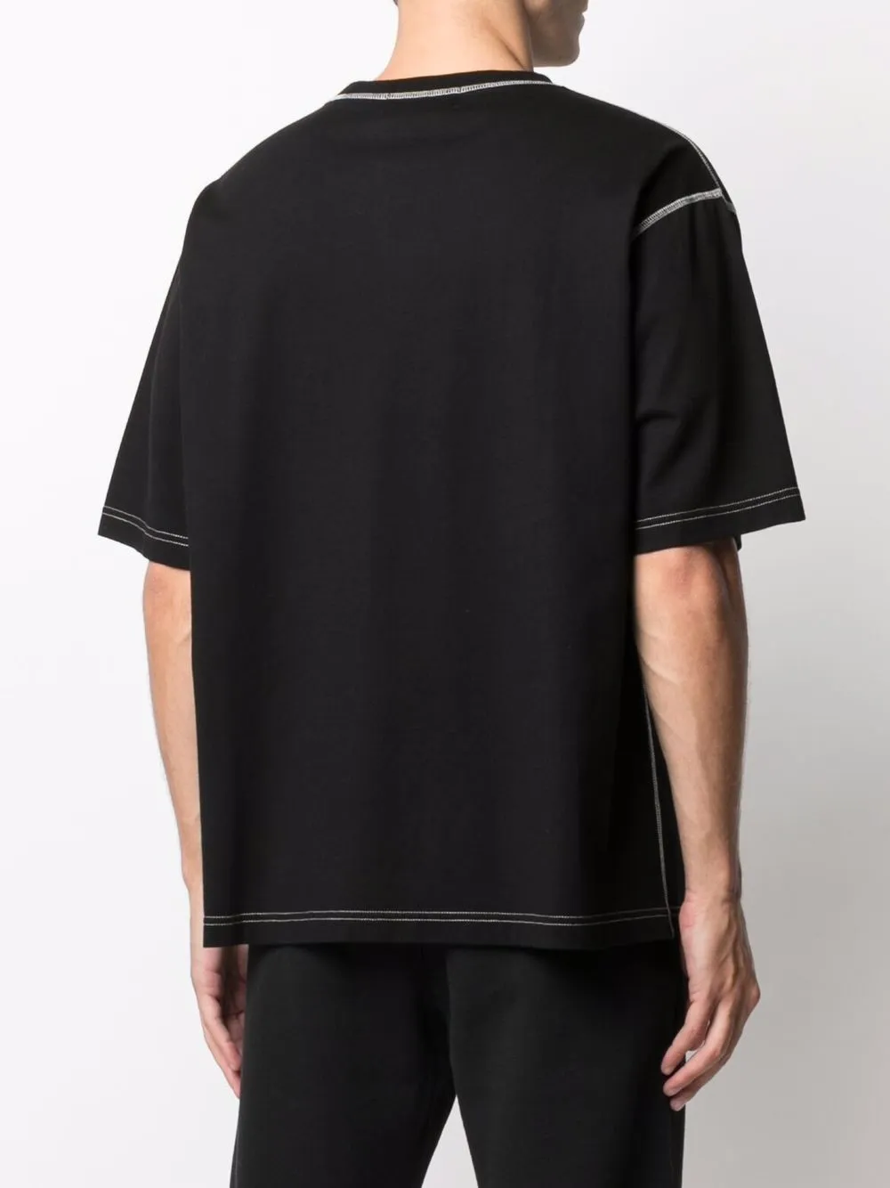 Вышитый логотип на груди, контрастная строчка, круглый вырез, короткие рукава и прямой подол. Цвет: черный.