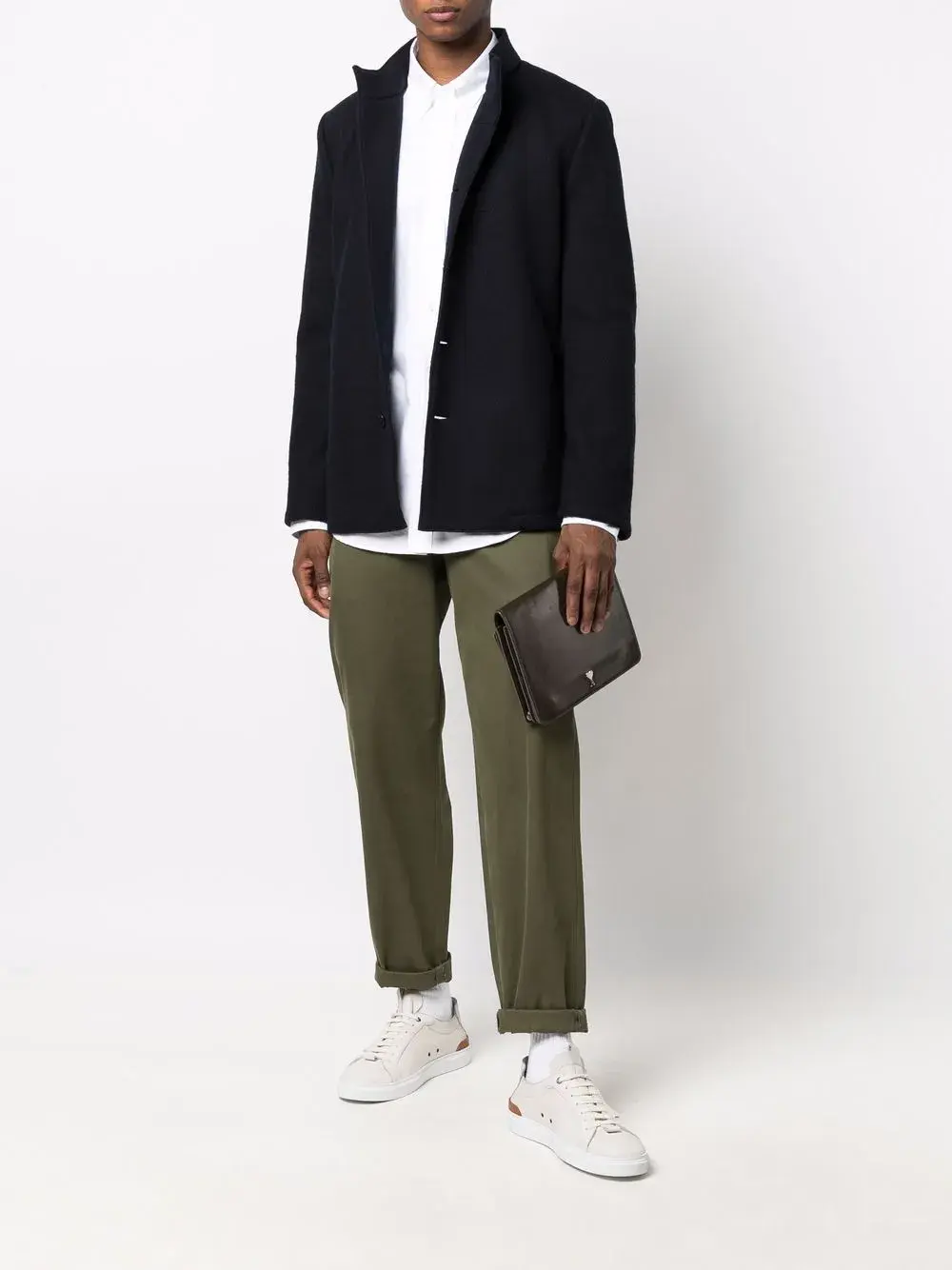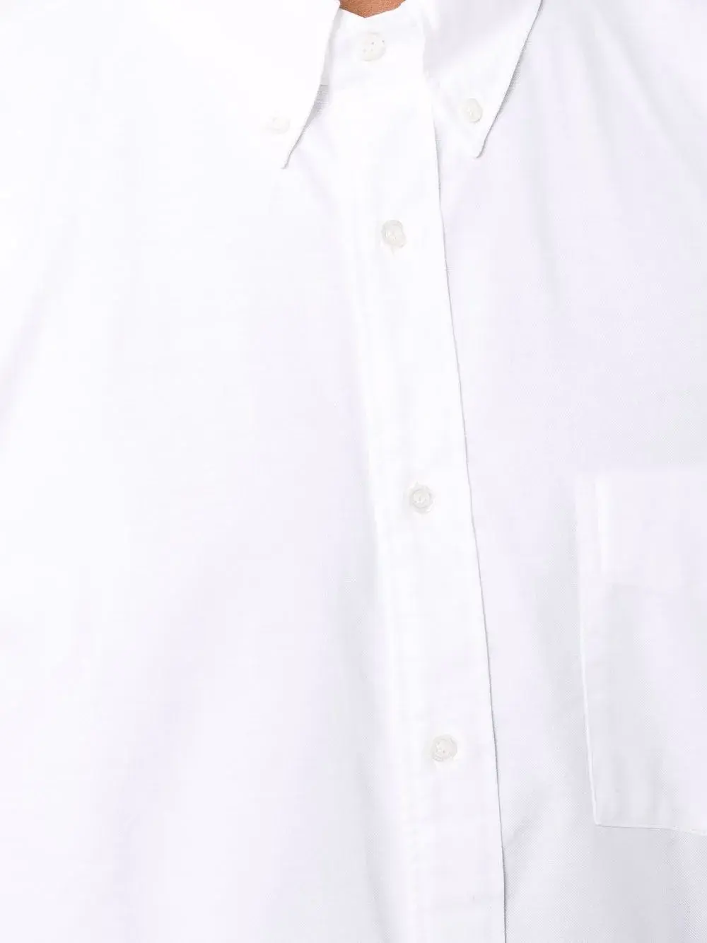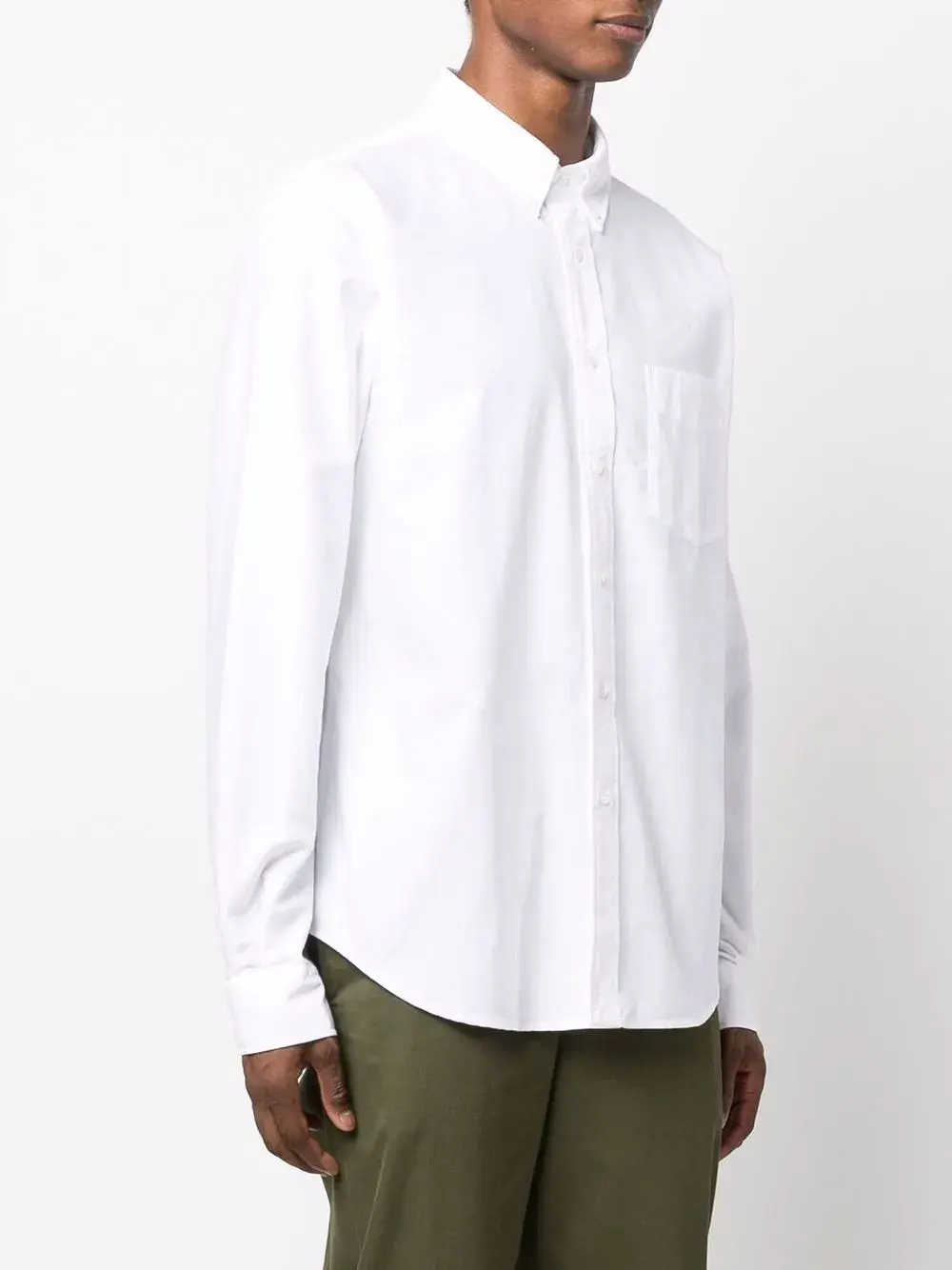 Воротник на пуговицах, длинные рукава, нагрудный накладной карман и застежка на пуговицах спереди. Цвет: белый.