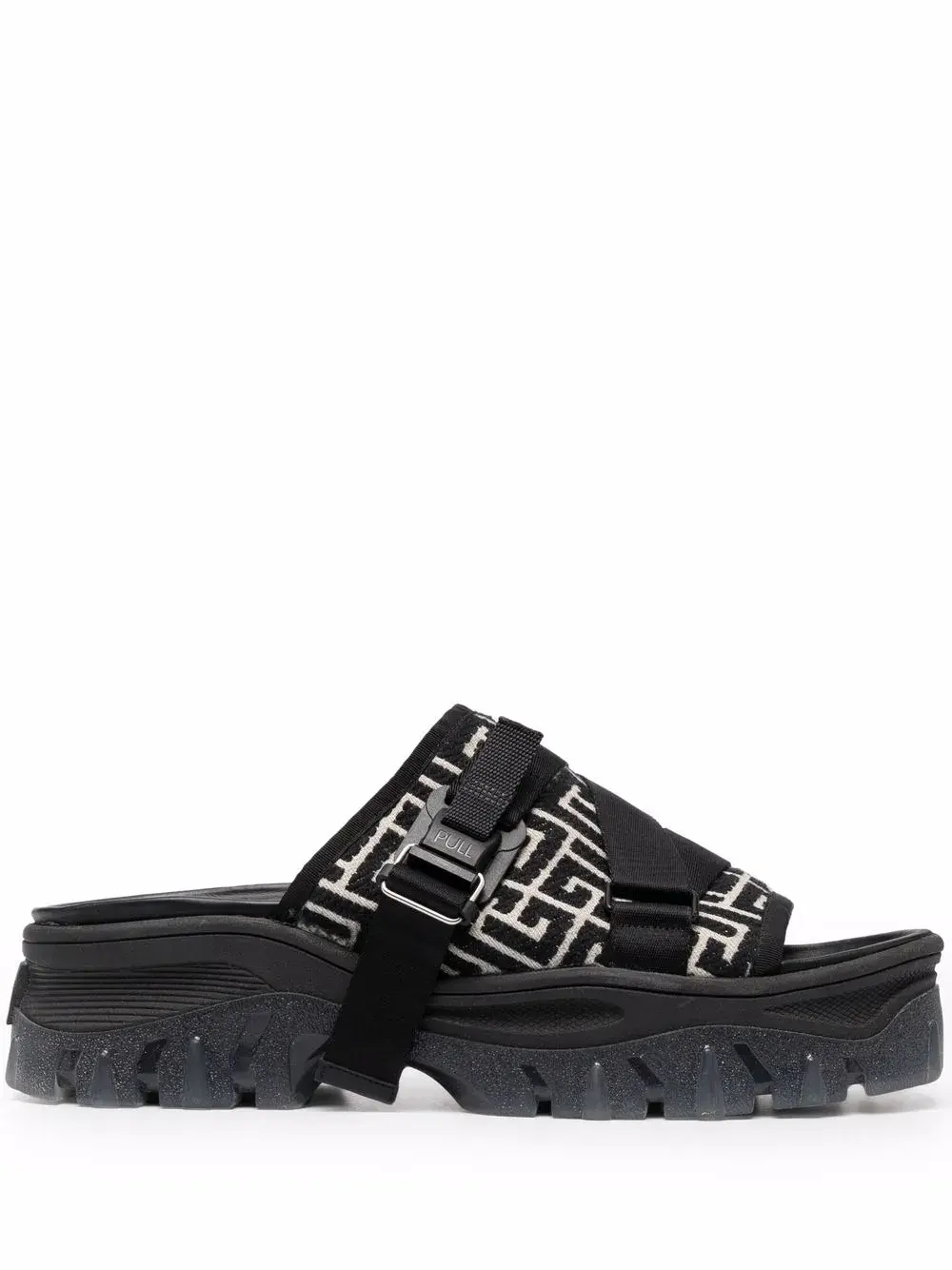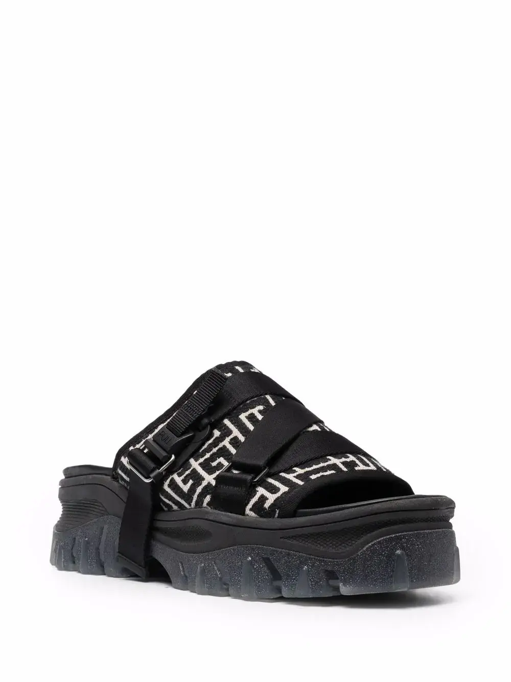 Узор с изображением монограммы, декоративные пряжки, модель без застежки, открытый носок и массивная резиновая подошва.