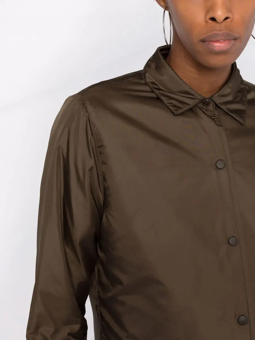 Классический воротник, застежка на пуговицах спереди, длинные рукава реглан, манжеты на пуговицах и закругленный подол.